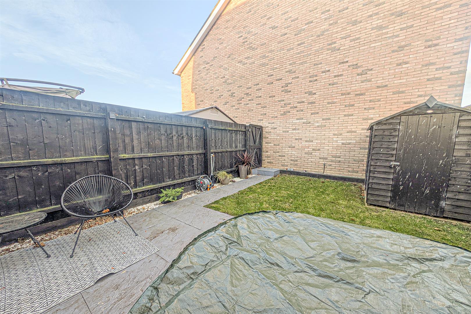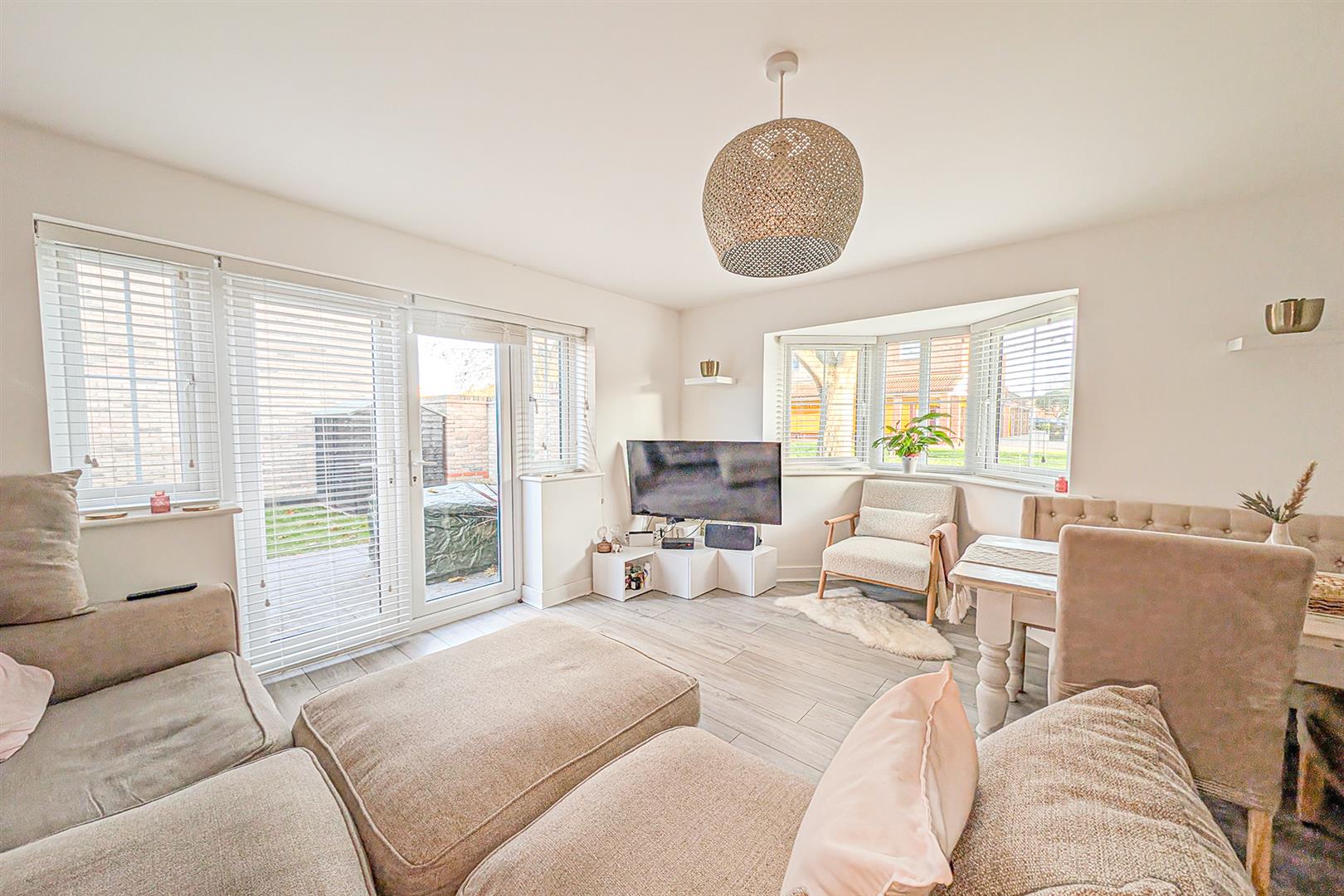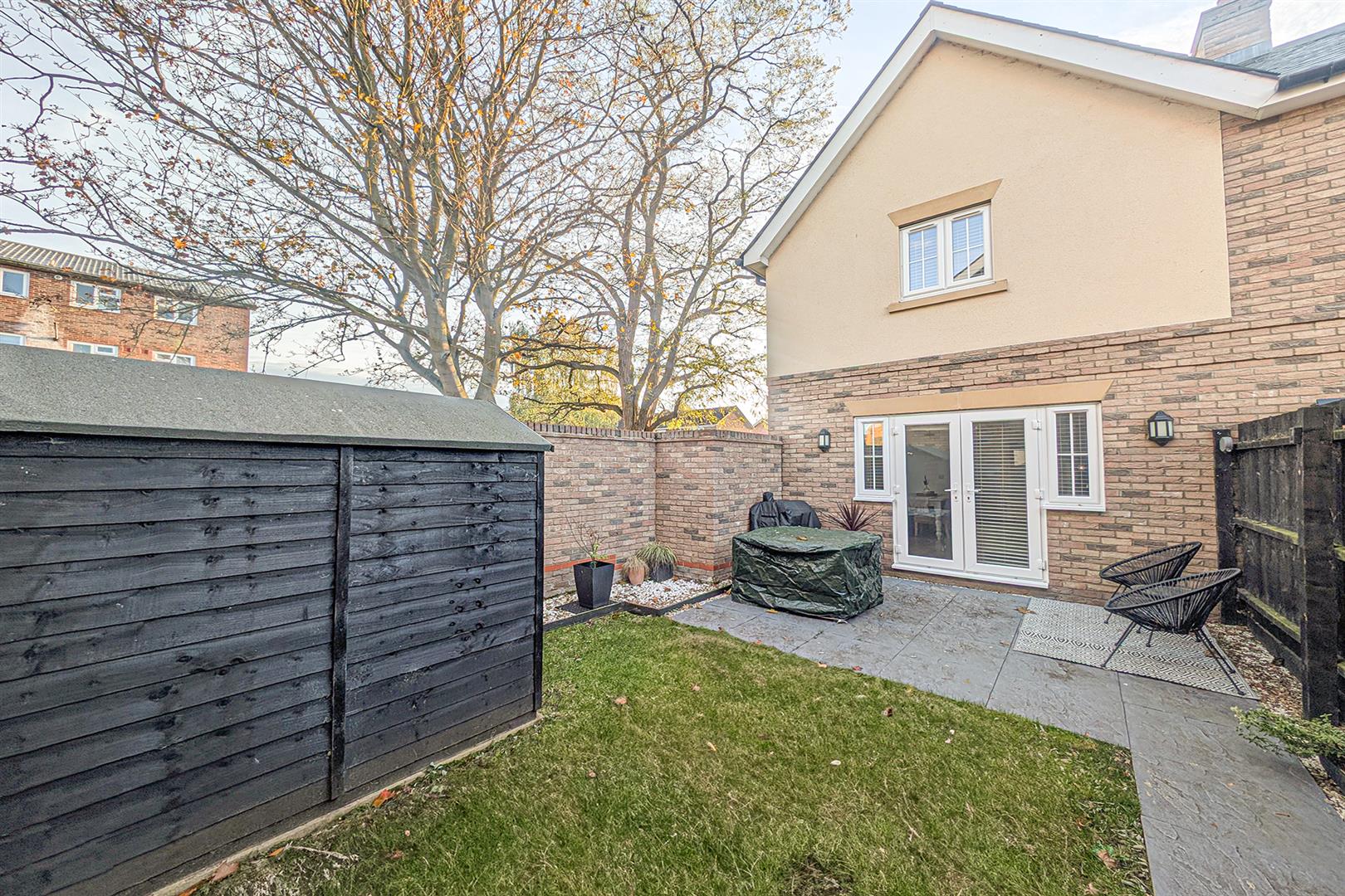 Patio area with French doors leading to the living/dining room. Lawned area. Pathway leading to the rear with an access gate that leads to a driveway that provides off road parking for two cars and has an EV charging point.