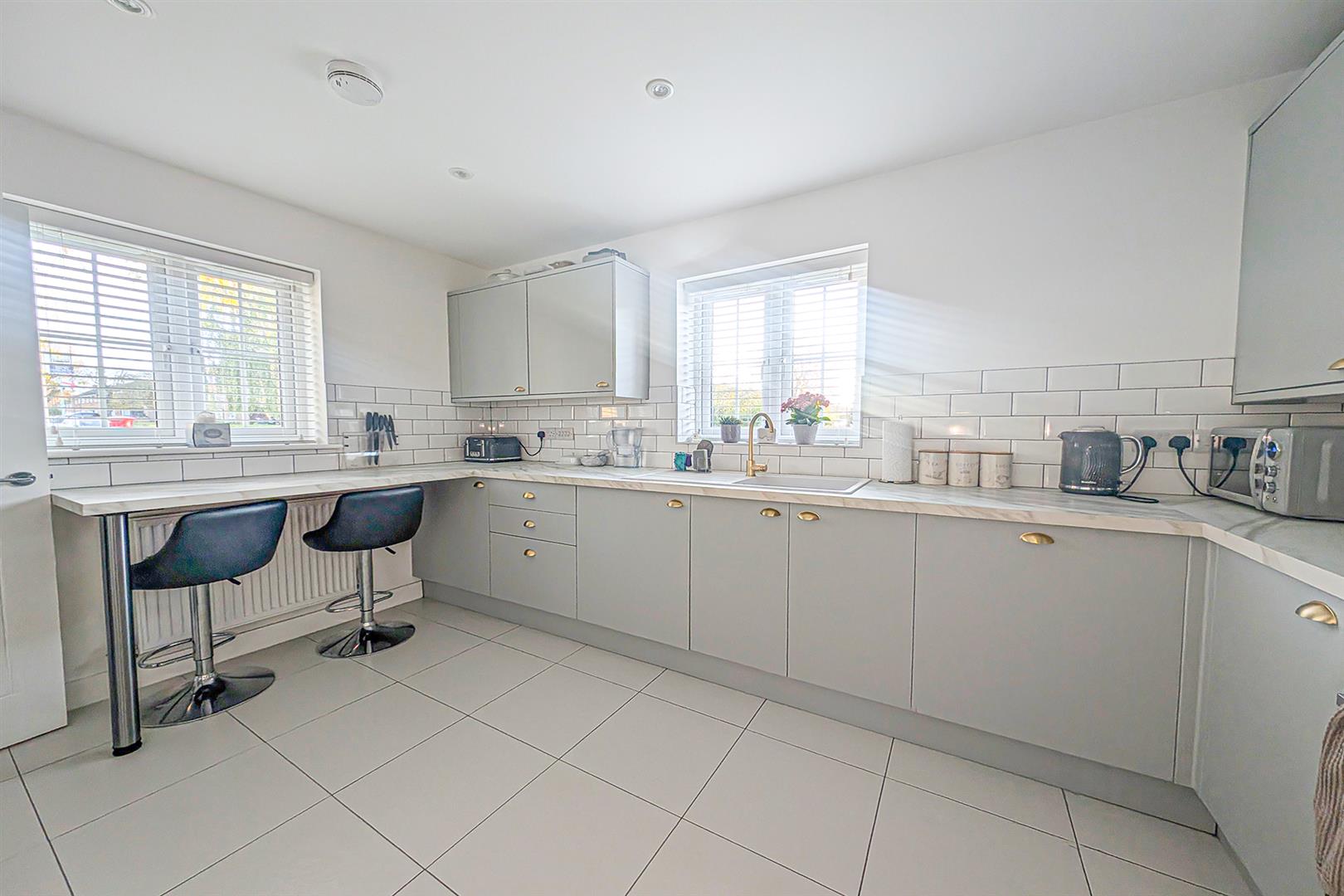 Stunning contemporary kitchen with a range of fitted eye and base level cupboards with granite worktop over with incorporated breakfast bar seating. Ceramic sink and drainer with mixer tap over. Integrated over with inset electric hob and stainless steel extractor over. Integrated fridge/freezer, dishwasher and washing machine. Attractively tiled splashbacks. Tiled flooring. Dual aspect windows. Door leading to entrance hall.