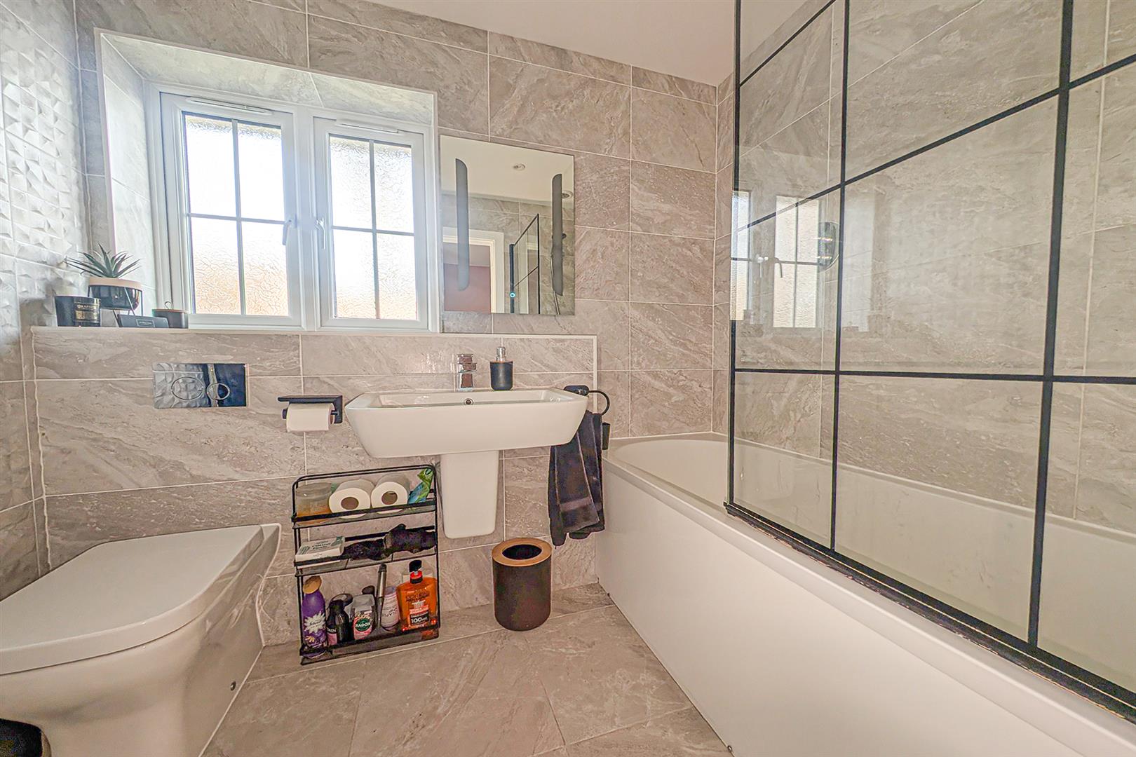 Contemporary white suite comprising low level, concealed cistern, W.C., wall mounted hand basin with mixer tap over and panelled bath with mixer tap and wall mounted shower over. Attractively tiled. Obscured window. Radiator. Door to landing.