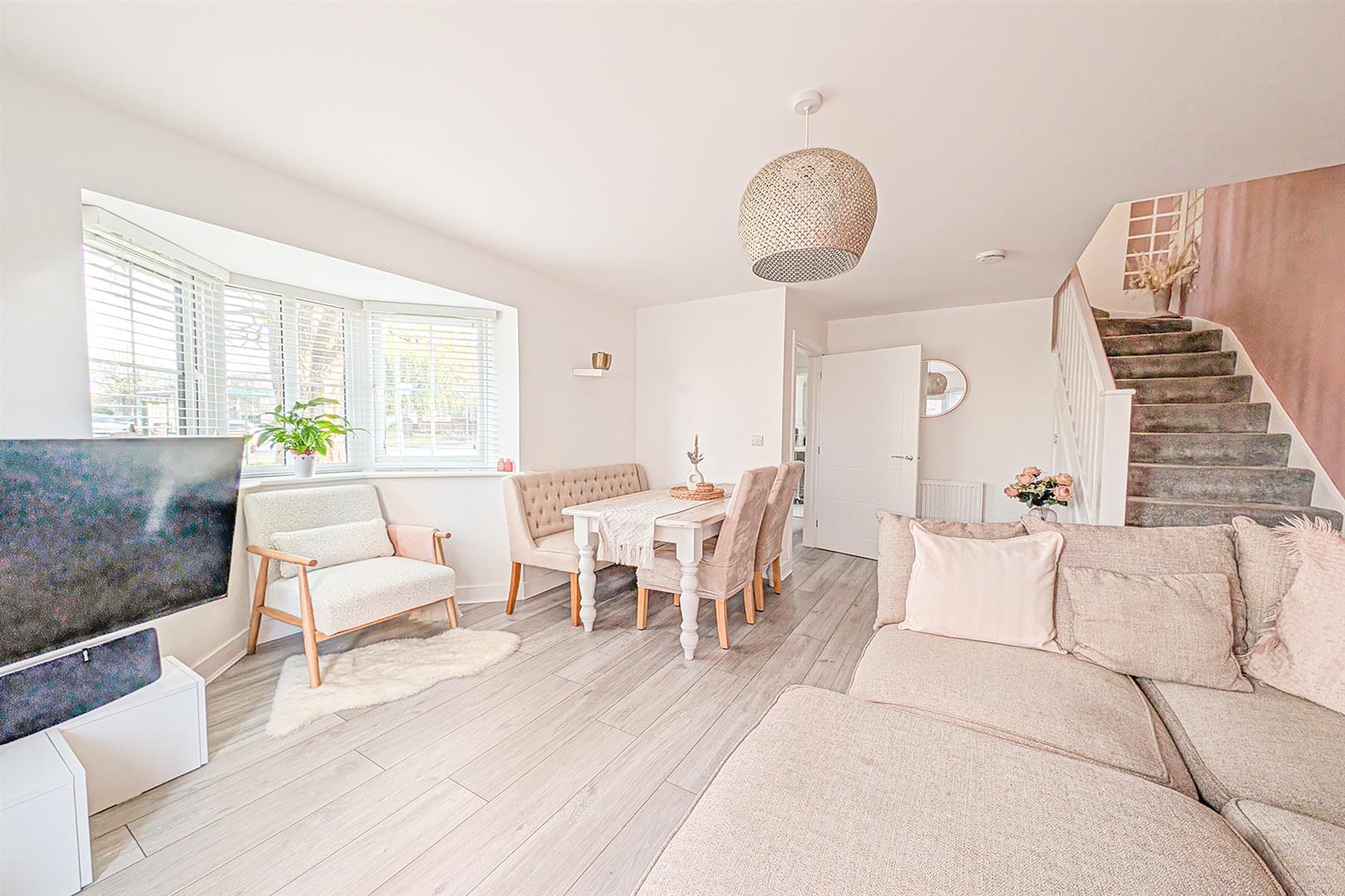 Beautifully presented living/dining room with bay window to the front aspect. French doors leading to the rear garden. LVT wood flooring. Dual radiators. Stairs leading to first floor with storage cupboard beneath. Door to entrance hall.