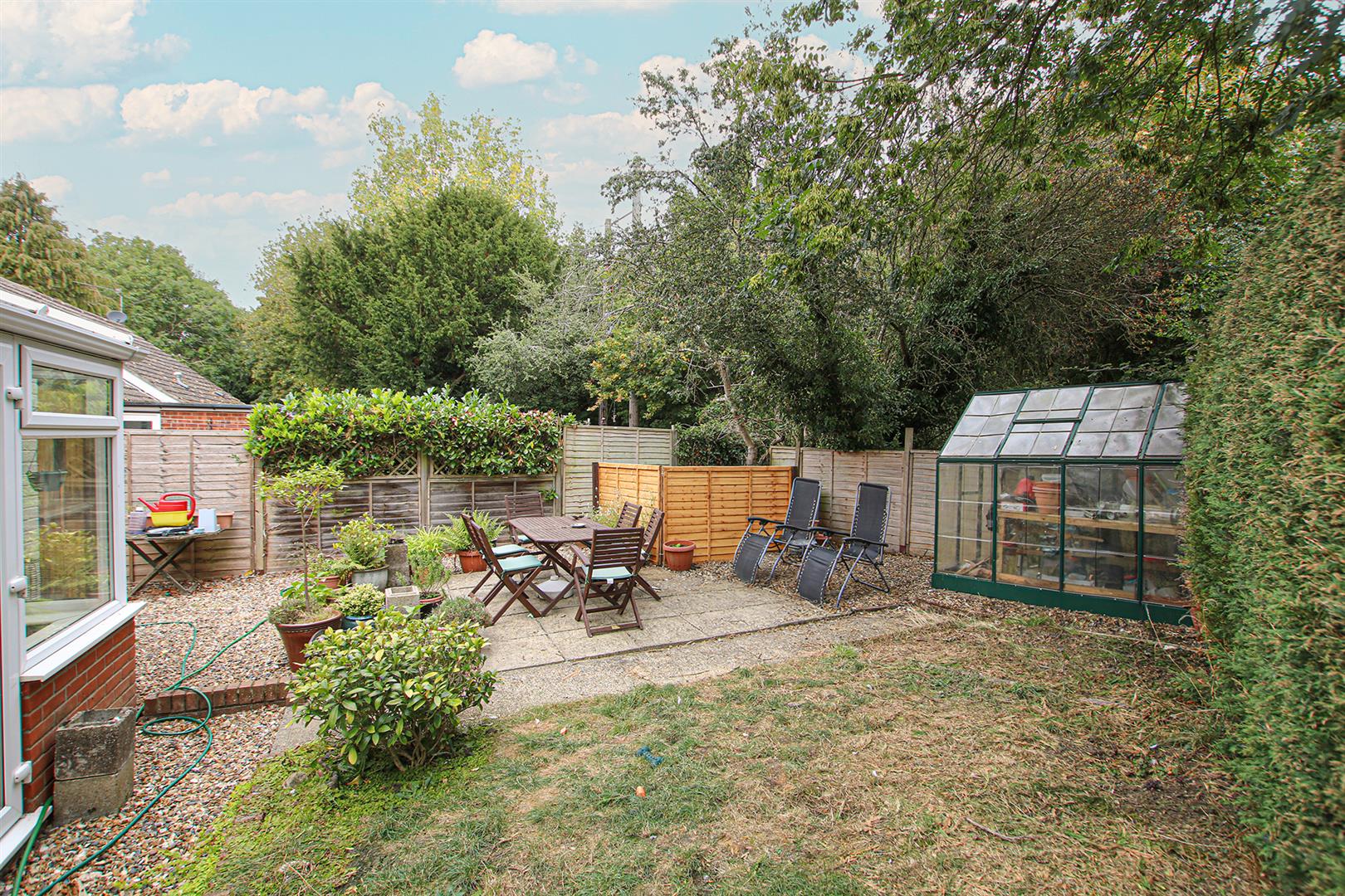 Patio area with gravel surround leading to French doors to conservatory and door to hallway. Lawned area with established hedge boundary. Further gravelled area with greenhouse. Oil tank. Access gate to the front.