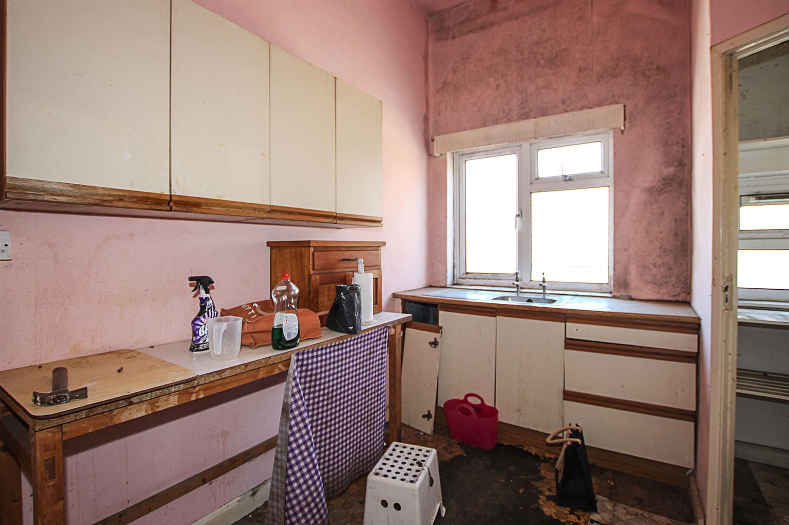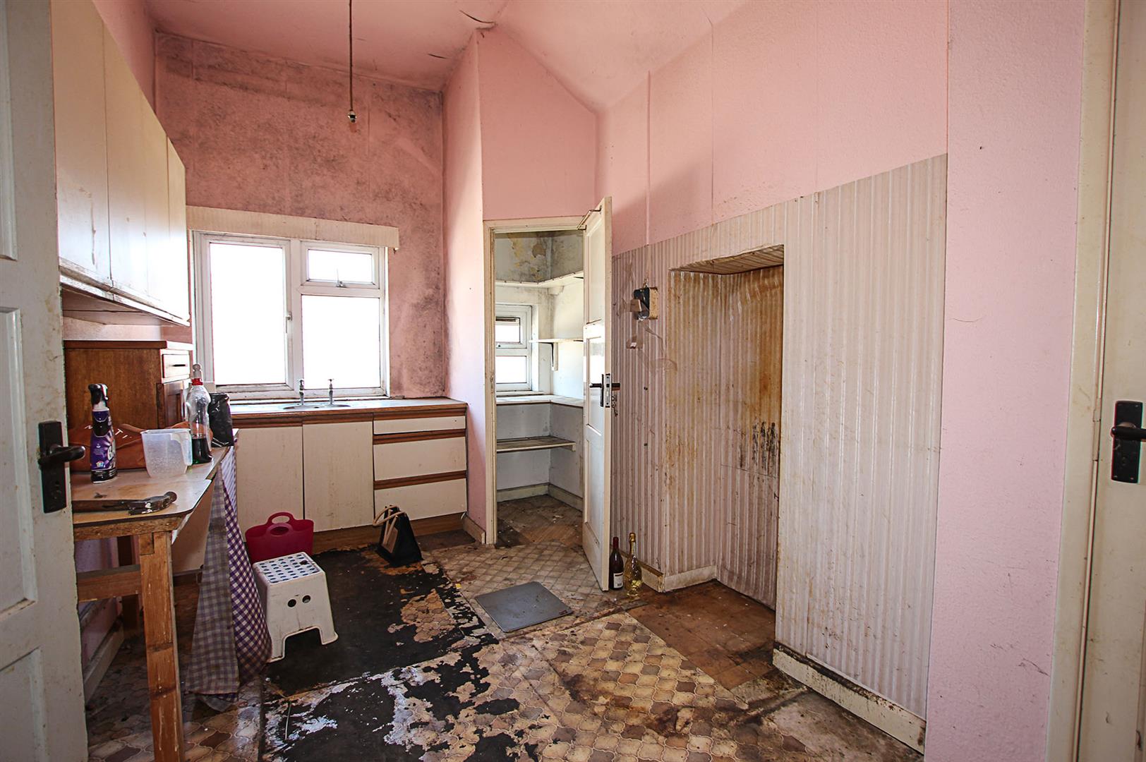 With window to the side aspect, fitted with wall mounted and base storage units with working surface over, sink unit, space for appliances, hatch opening to living room, storage cupboard and larder cupboard (with window to the side aspect).