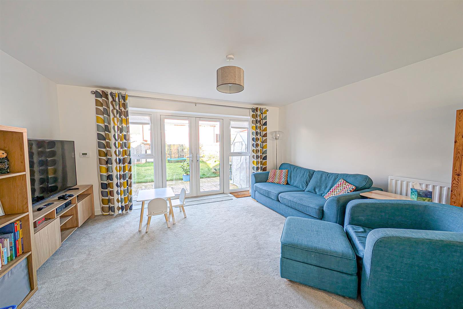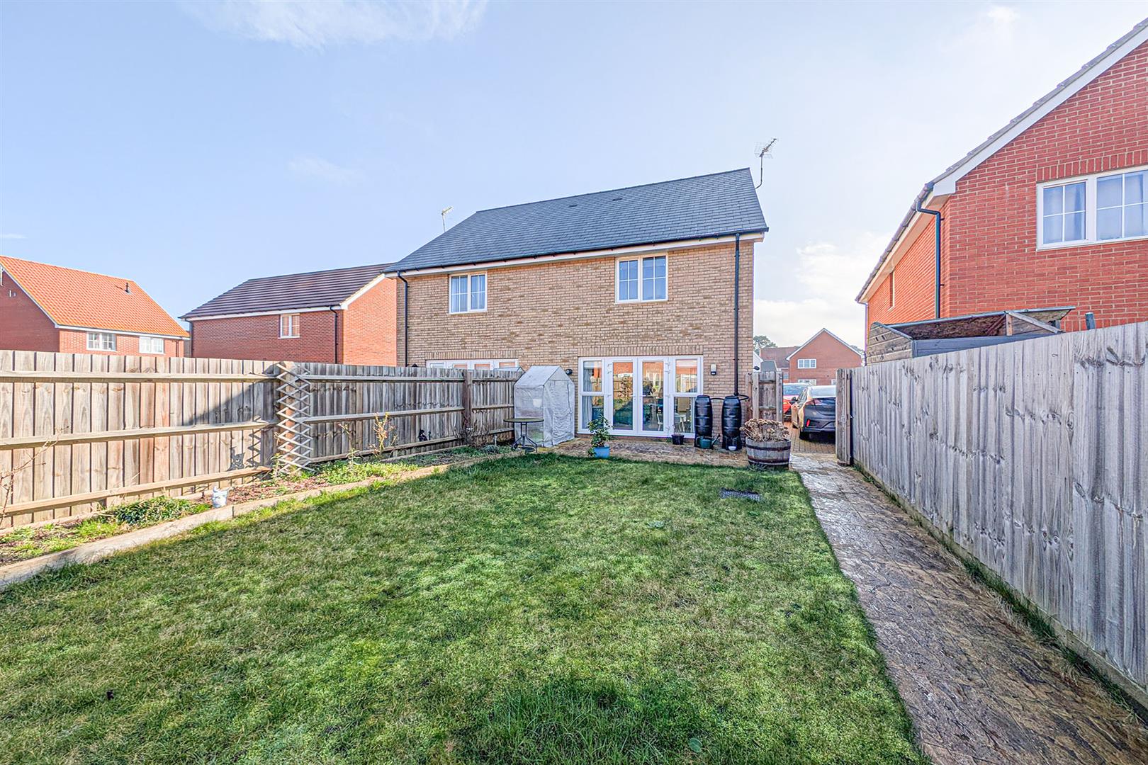 Patio area to the rear of the house with French doors leading to the living room. Side pathway leading to the rear of the garden with timber shed. Lawned area with planted side border. Access gate to the front.