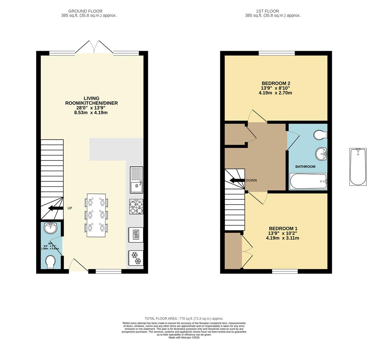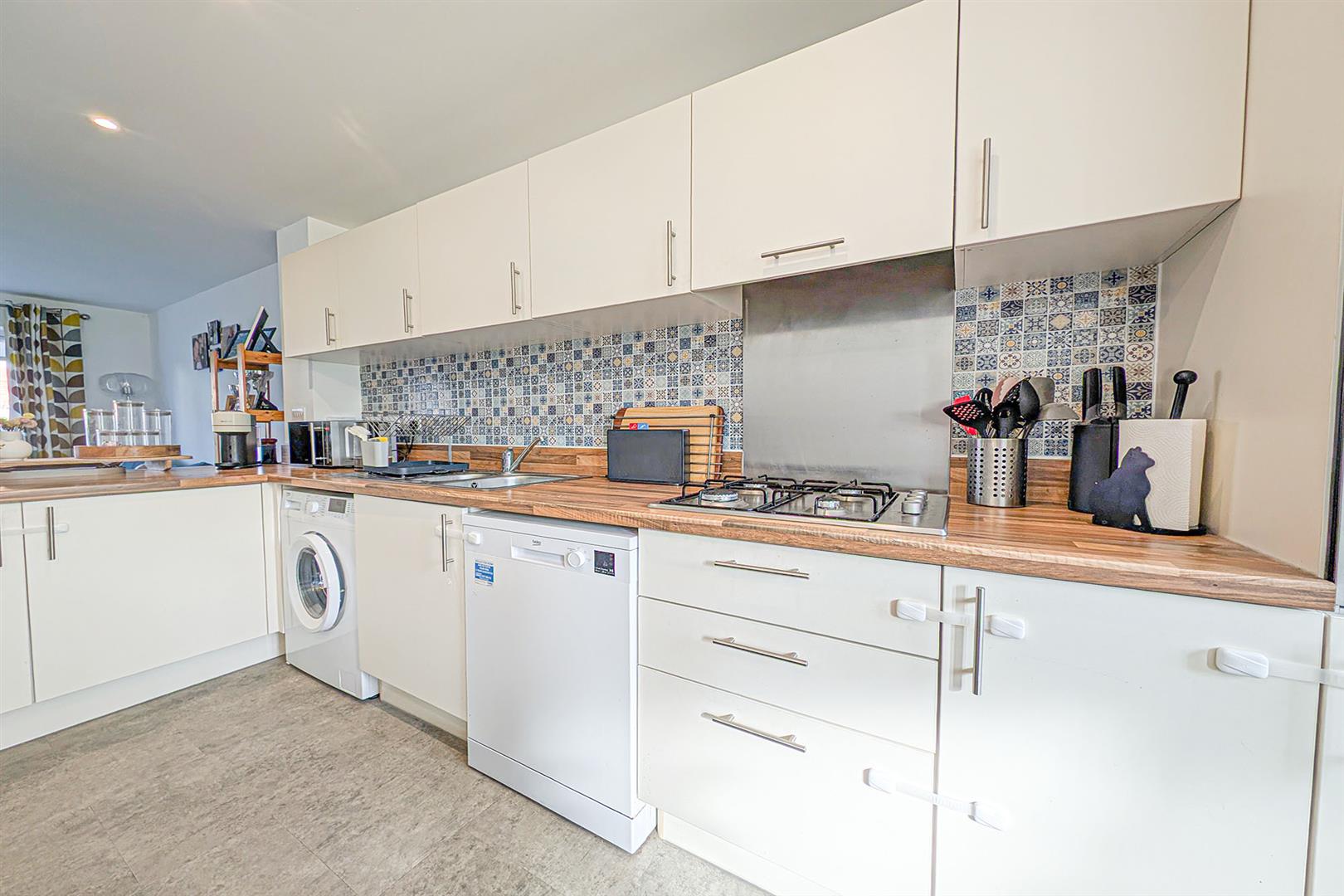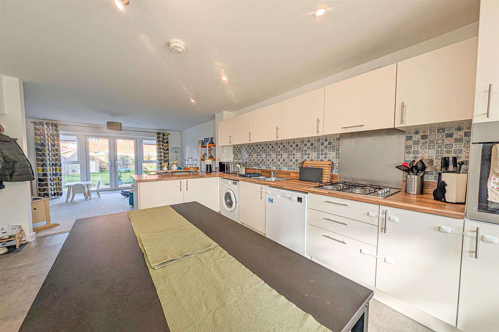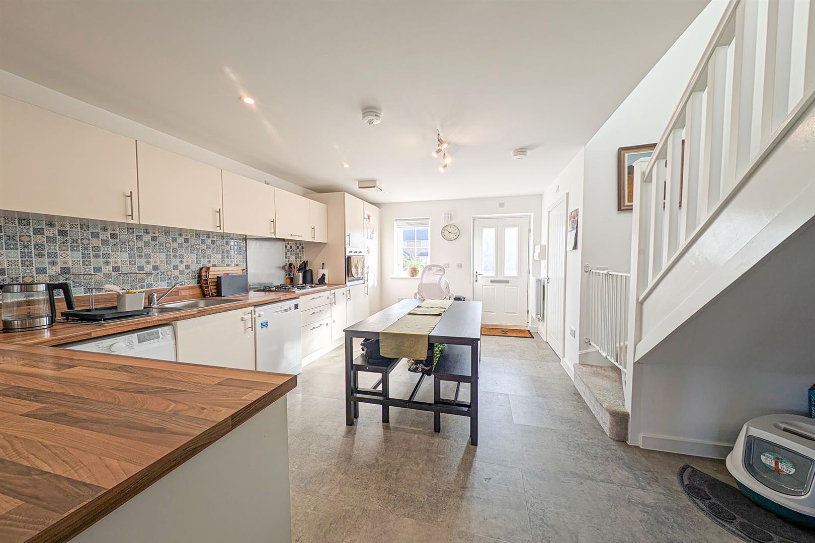 Superb open plan kitchen/dining/living room. Kitchen: a range of eye and base level cupboards and storage drawers with wooden worktop over. Stainless steel sink and drainer with mixer tap over. Space and plumbing for washing machine and dishwasher. Integrated eye level oven. Inset gas hob with extractor above. Integrated fridge/freezer. Attractively tiled splashbacks. Tiled flooring. Spacious living area with French doors leading to the rear garden. Radiators. Stairs leading to the landing. Doors leading to the cloakroom and front.