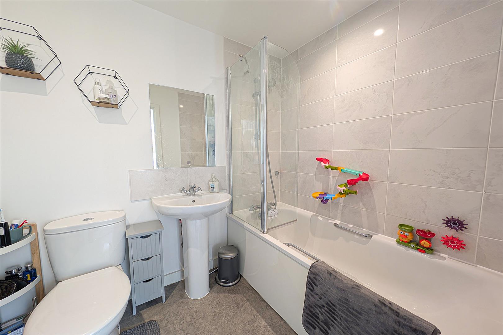 Modern white suite comprising low level W.C., pedestal handbasin with mixer tap over, panelled bath with mixer tap over and wall mounted shower. Attractively tiled to wet areas. Radiator. Door leading to the landing.