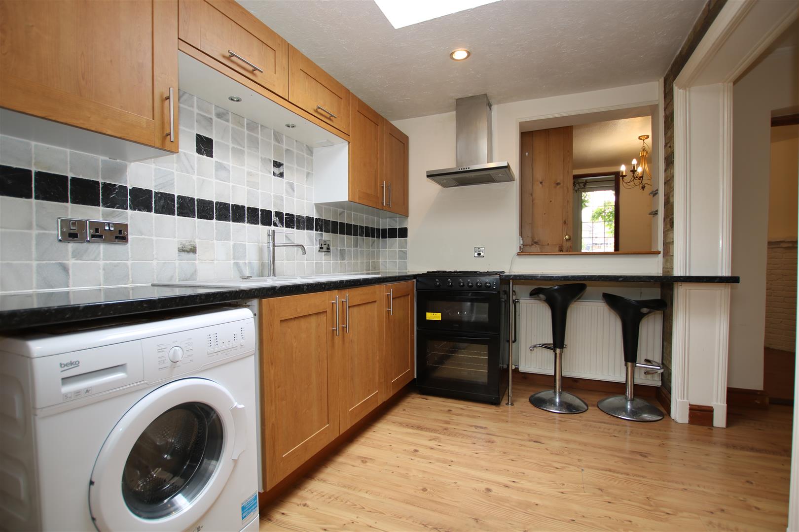 Fitted with a range of matching eye and base level storage units with work top surfaces over. Sink and drainer with mixer tap over. Tiled splashbacks. Oven with extractor hood over. Breakfast bar with room for bar stools. Space and plumbing for washing machine. Storage cupboard. Double glazed window and door to rear aspect.