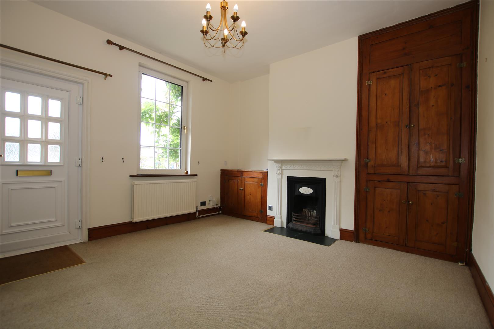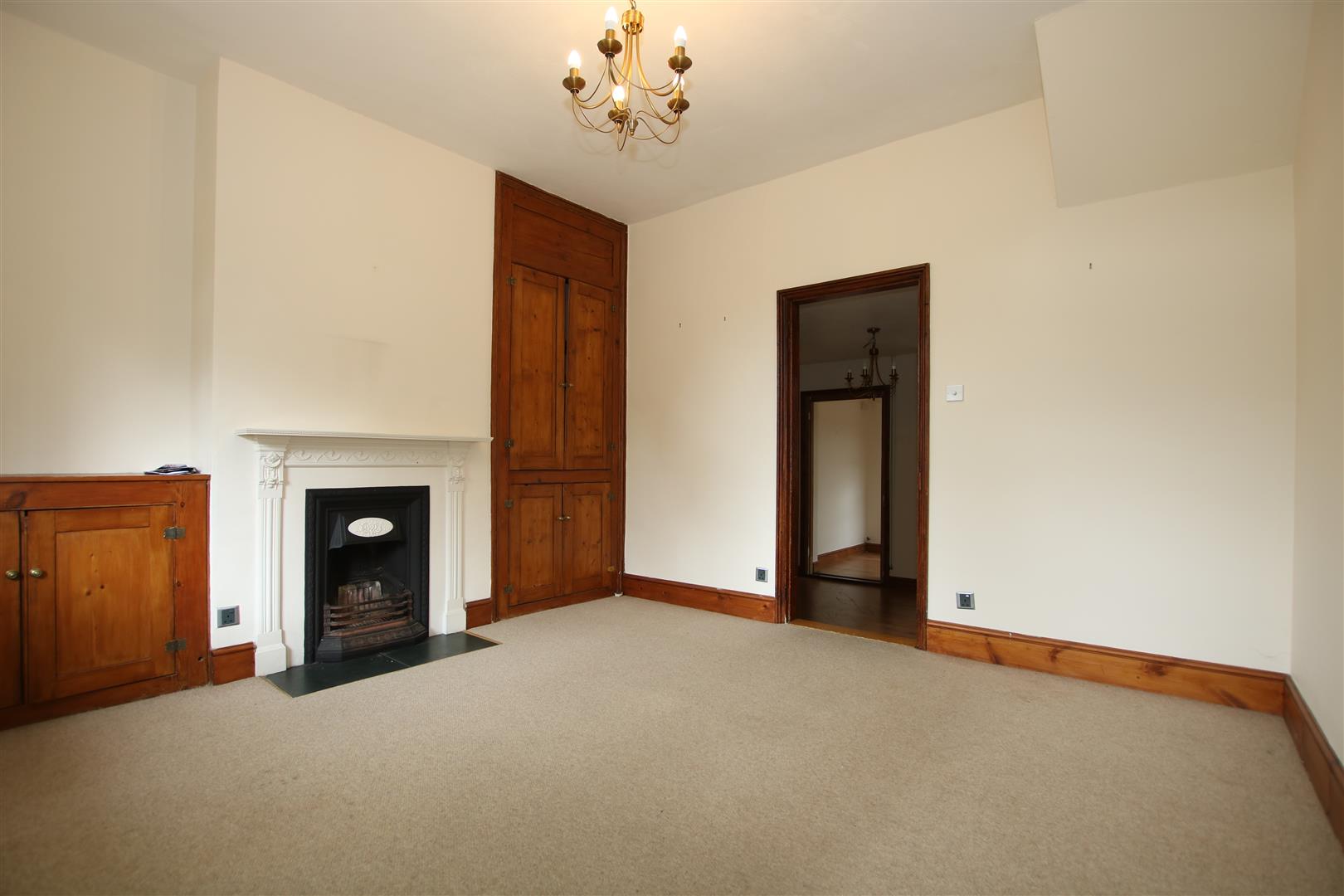 With double glazed window to front aspect, feature fireplace, built in storage cupboards, radiator, steps down to: