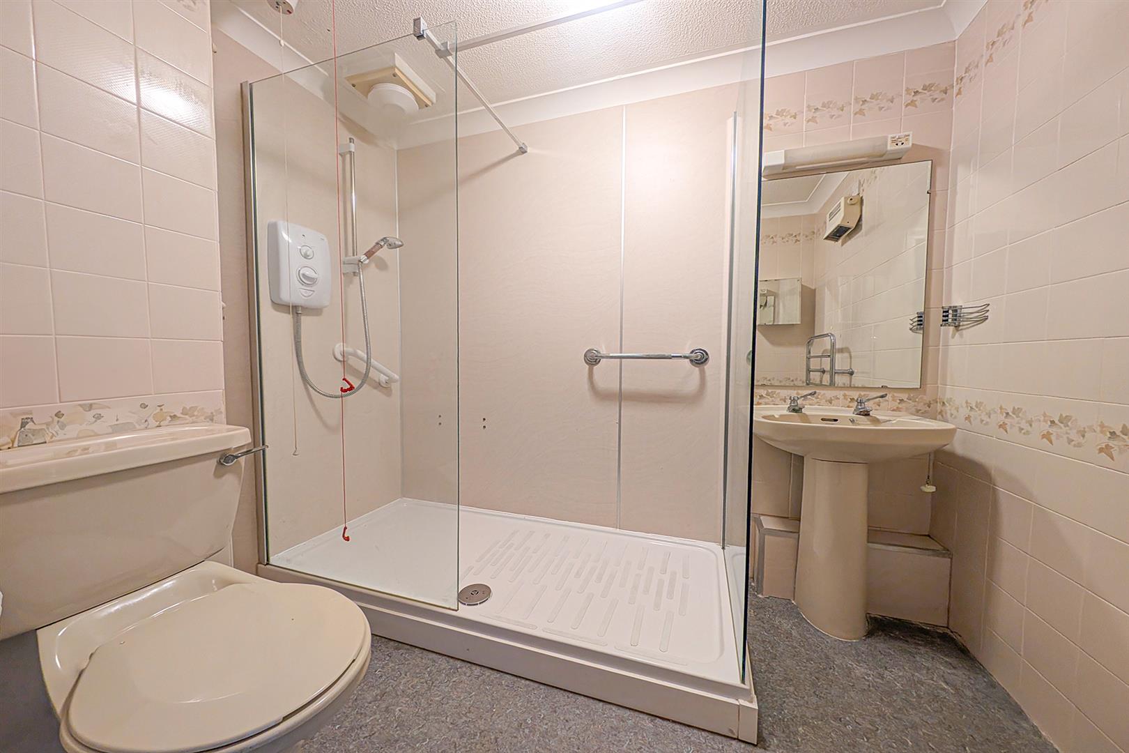 Re-fitted bathroom with walk in shower enclosure, wash hand basin and low level WC, tiled walls, towel radiator and electric heater.