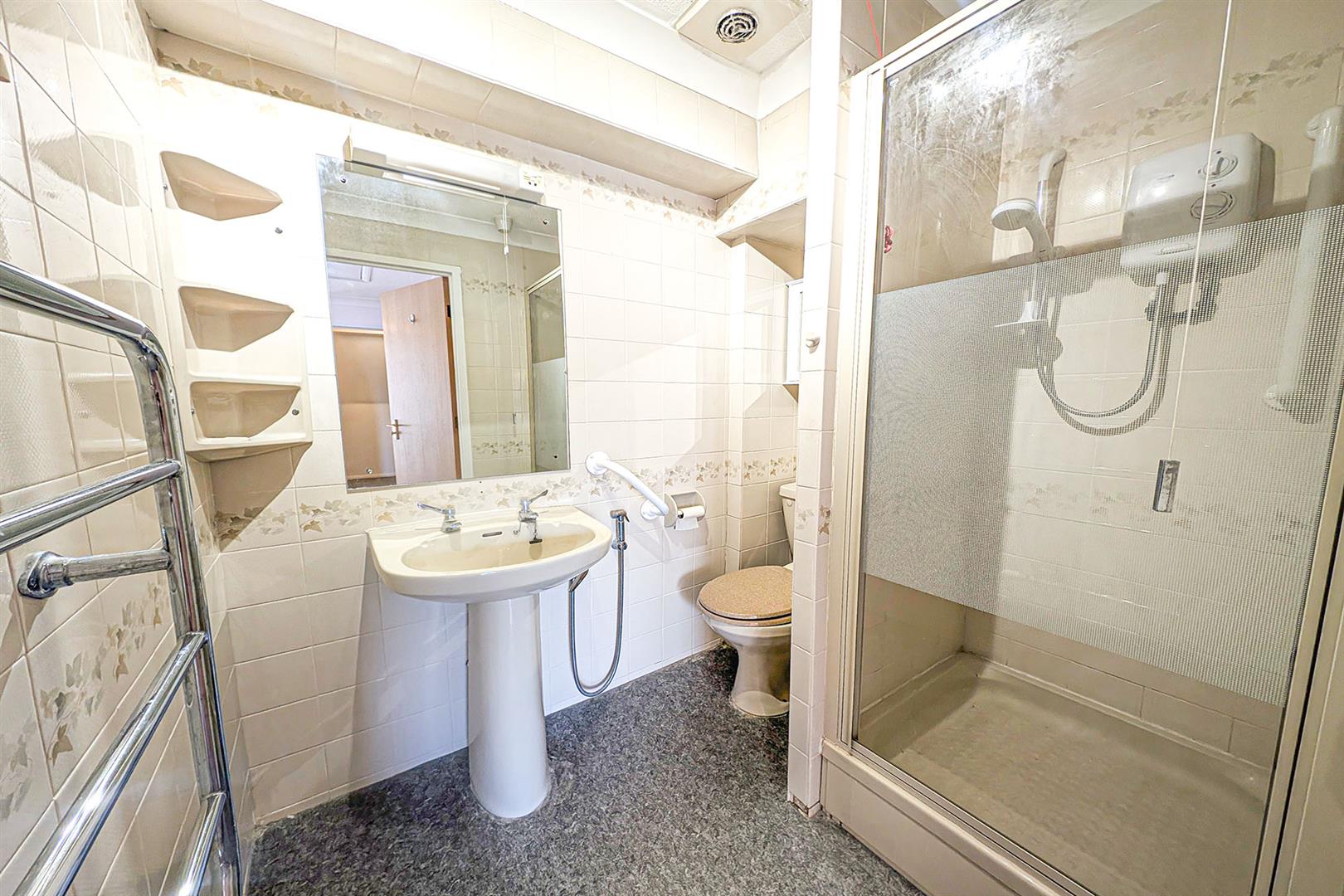White suite comprising low level W.C., pedestal hand basin and generous walk-in shower. Obscured window. Door to lounge.