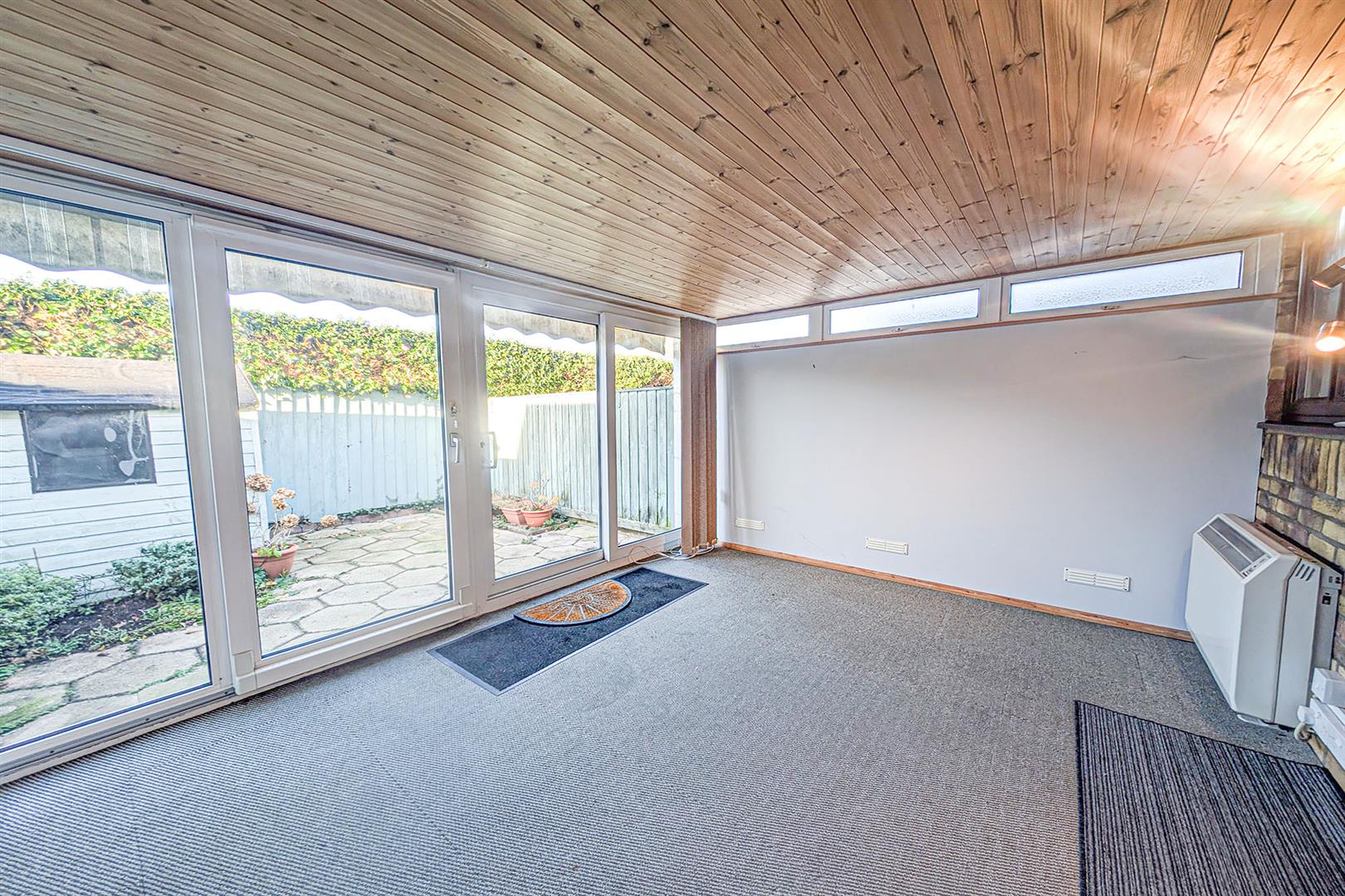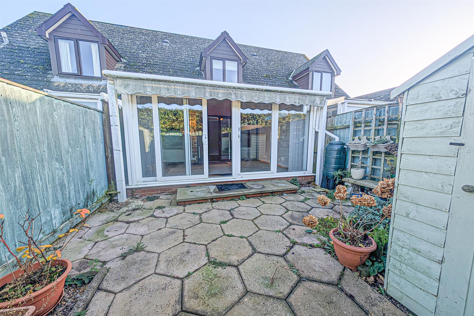 Courtyard style garden with timber shed. Double french doors leading to the conservatory.