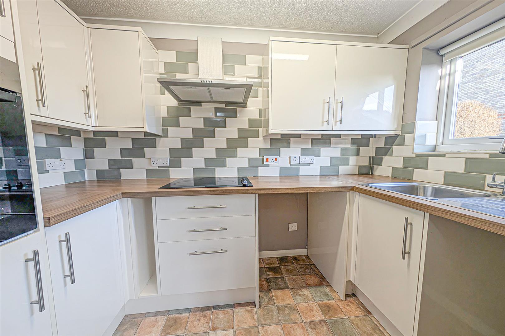 Modern kitchen fitted with a range of matching eye and base level cupboards with worktop over. Stainless steel sink and drainer with mixer tap over. Inset electric hob with stainless steel extractor above. Space for under counter appliances. Attractively tiled splashbacks. Window to the front aspect. Door to the lounge.