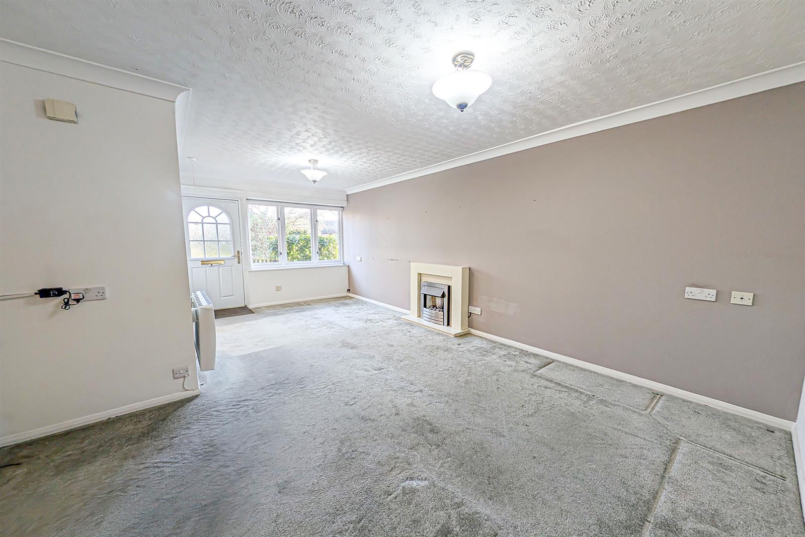 Spacious lounge with window to the front aspect. Electric coal effect fire place with white surround and hearth. Storage heater. Window to the front aspect. Doors leading to the kitchen, dining room/bedroom, bathroom and front. Understairs storage cupboards. Stairs leading to the first floor landing.