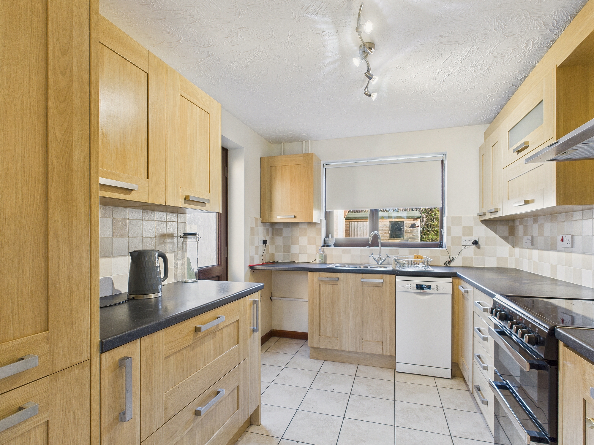 uPVC double glazed window to rear, uPVC double glazed door to side, wall mounted double panel radiator, a range of wall and base units under round edge work surfaces, 1 1/2 stainless steel sink drainer inset with mixer tap over, space for slimline dishwasher, space for washing machine, space for free standing electric oven and hob with extractor over, textured ceiling, tiled flooring, wall mounted gas central heating boiler, integral fridge.