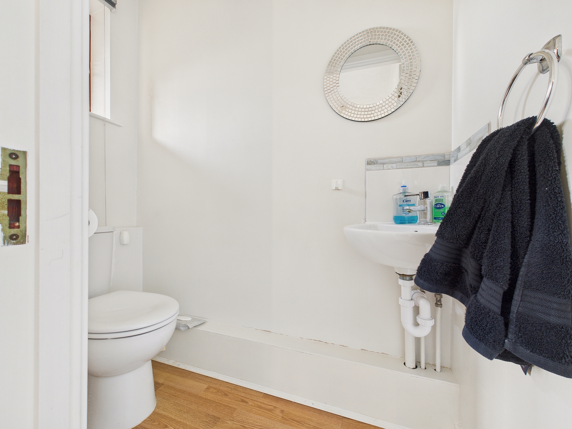 uPVC double glazed window to front, wall mounted single panel radiator, WC, hand wash basin, laminate style flooring, textured ceiling.