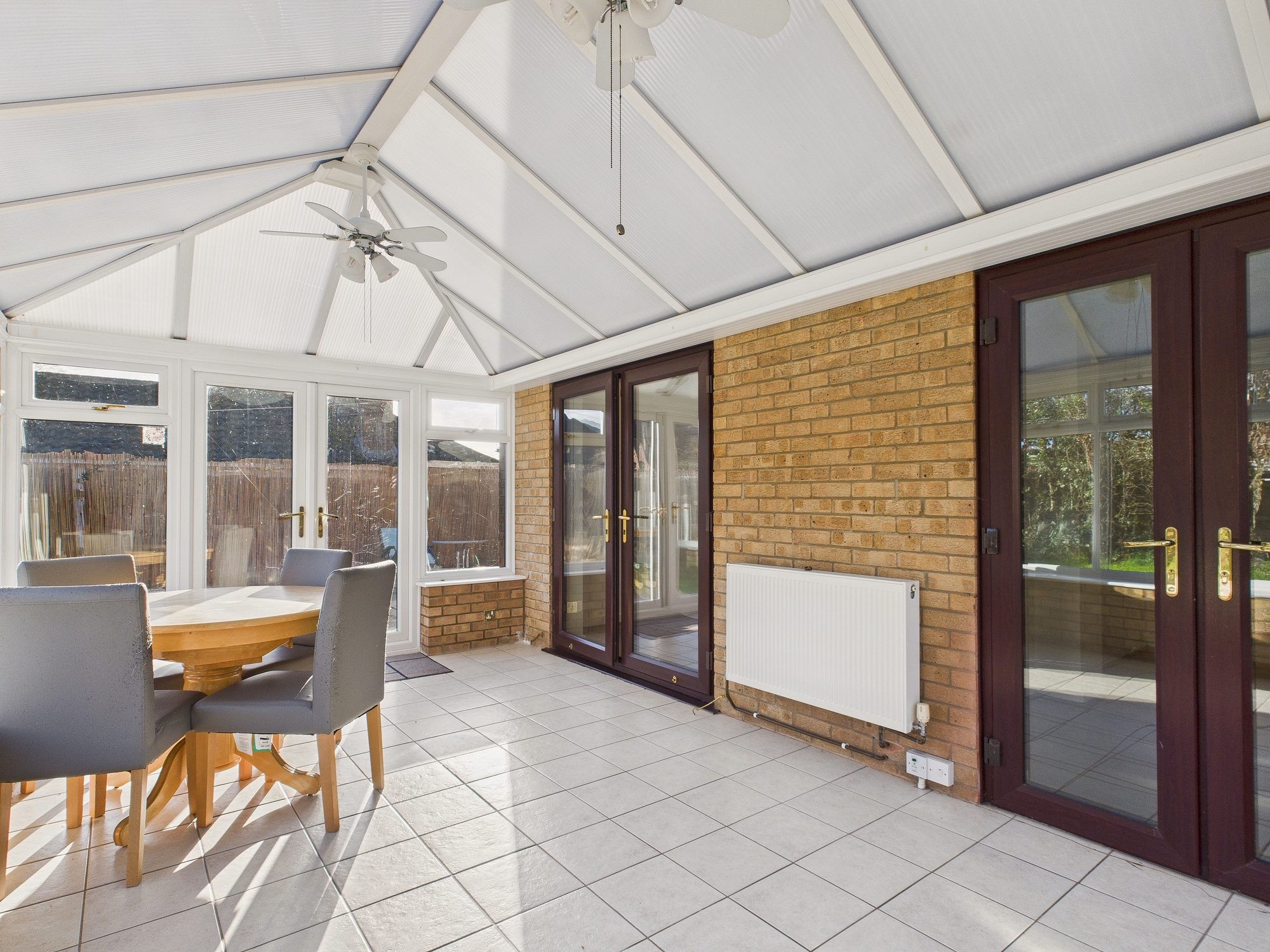 Wall mounted single panel radiator, uPVC double glazed doors to conservatory, laminate style flooring.