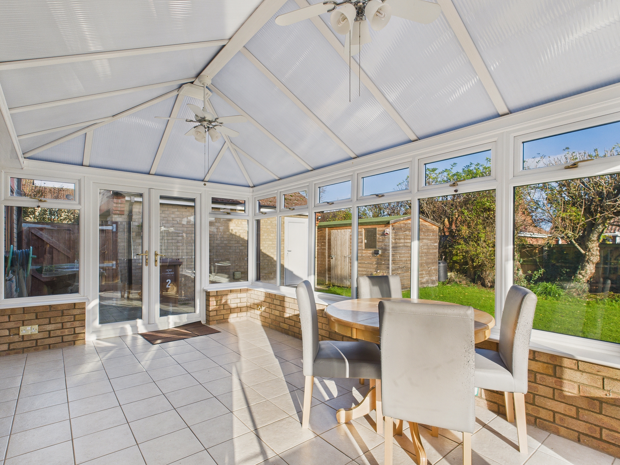 Part brick and uPVC double glazed construction with vaulted polycarbonate roofing with double ceiling fans, wall mounted double panel radiator, two uPVC double glazed patio doors to rear garden, tiled flooring.