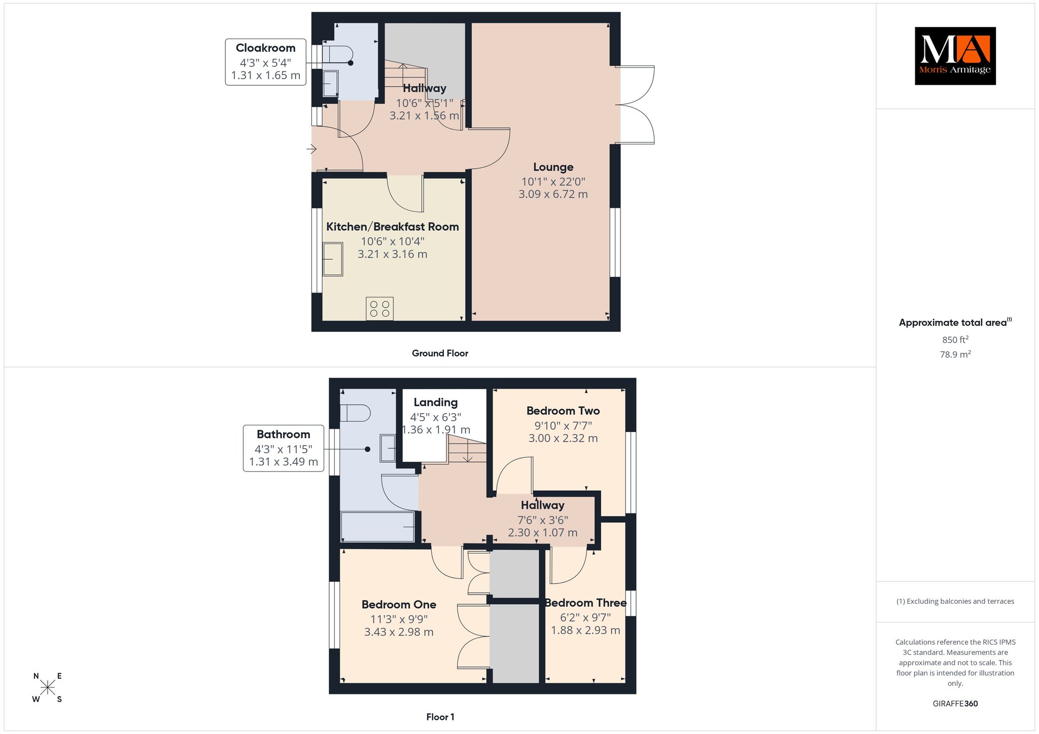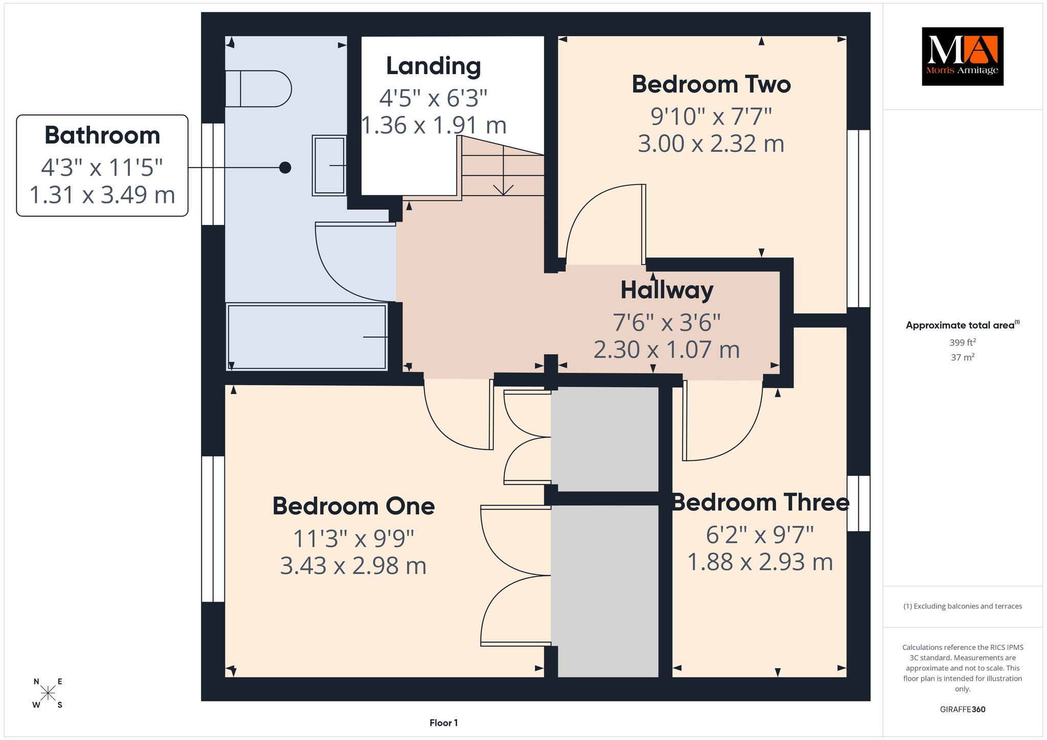 Bedroom One 11’3” x 9’9” (3.43m x 2.98m)