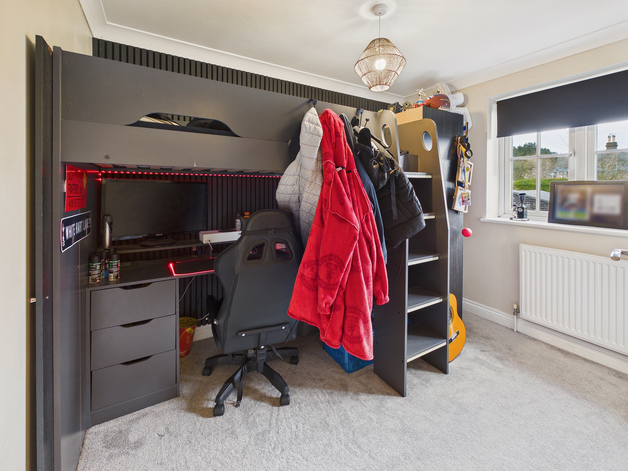 Wall mounted radiator, uPVC double glazed window to rear.