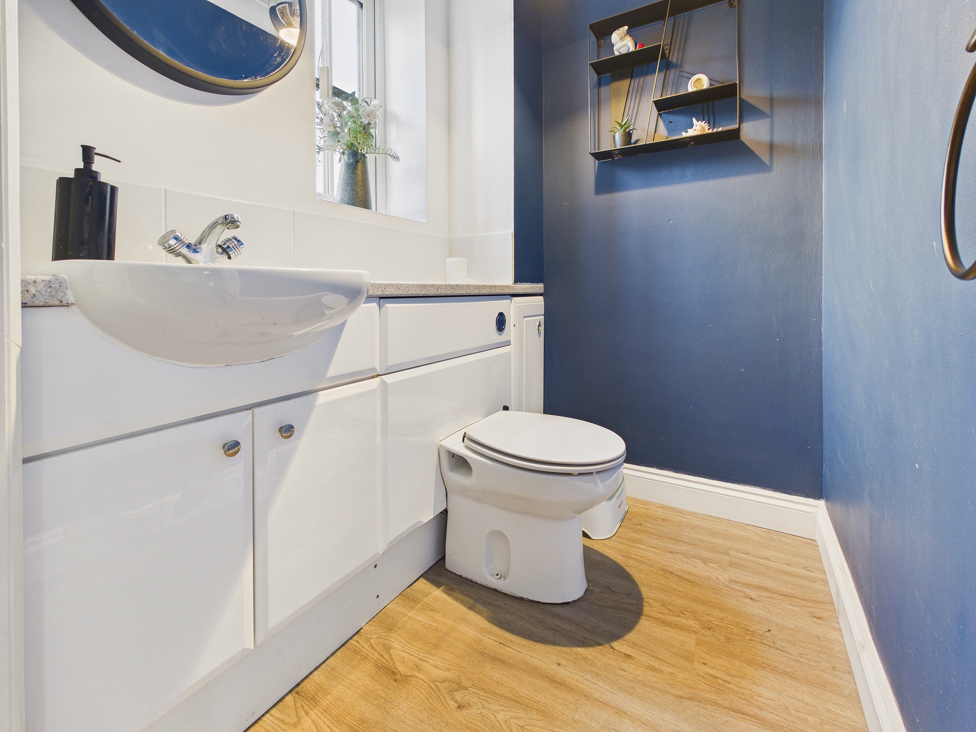Low level w.c. and handwash basin inset to vanity unit storage unit, uPVC double glazed window to front, extractor fan.