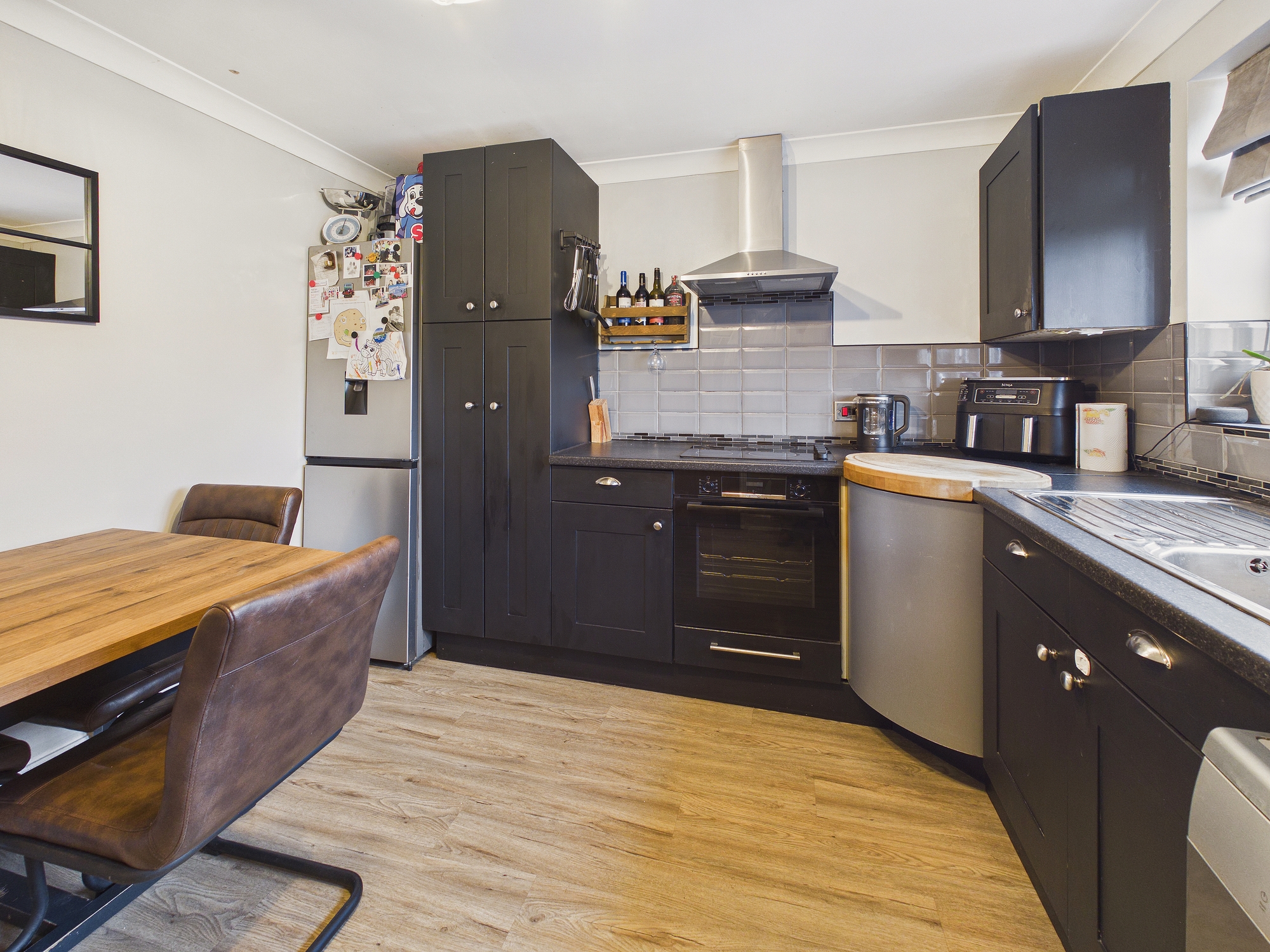 Matching wall and base units with worktop over, stainless steel sink drainer, space for washing machine and dishwasher, electric oven and hob with extractor over, uPVC double glazed window to front.