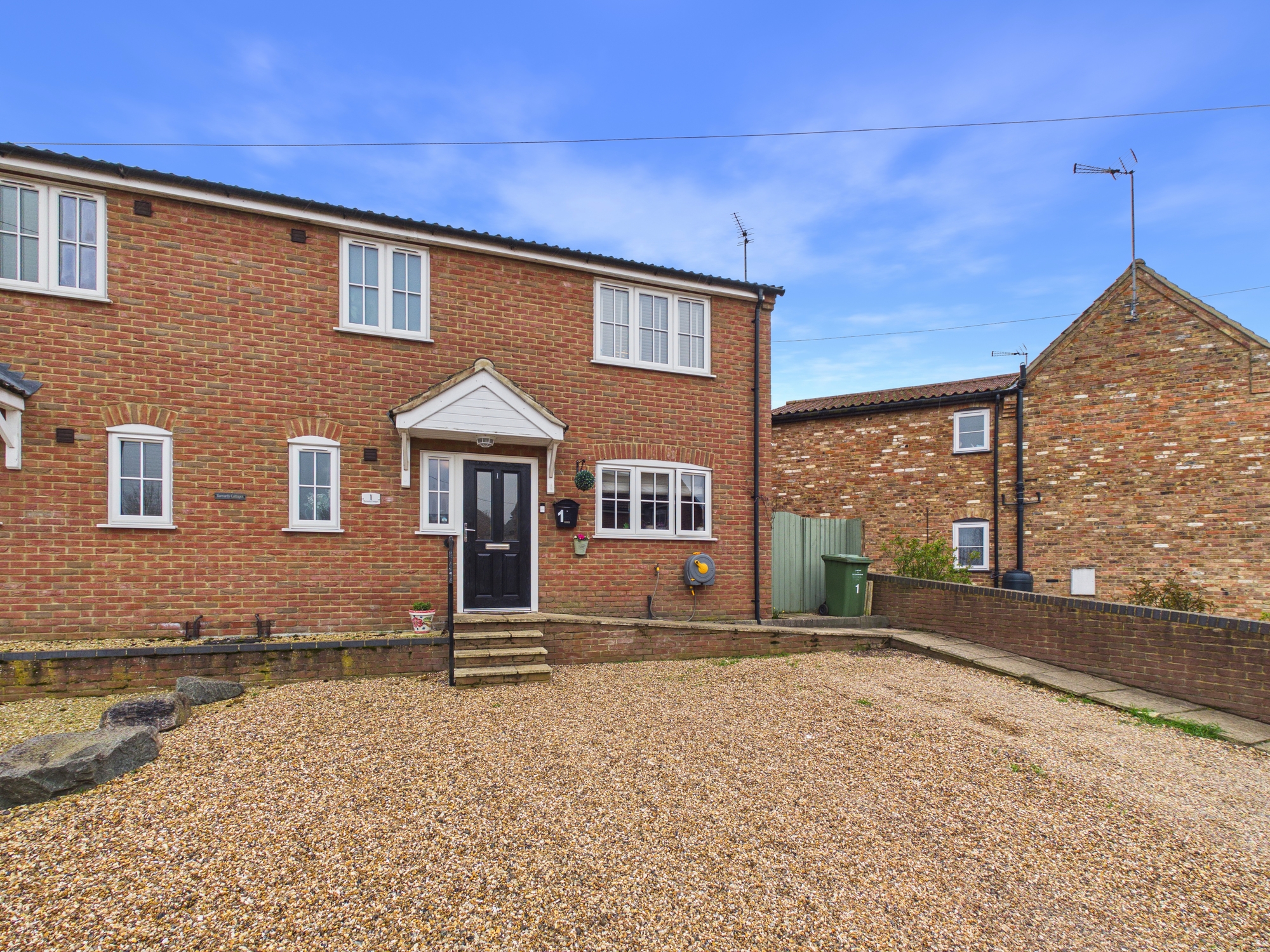 To the rear there is a low-maintenance garden, mainly laid to lawn with a patio area ideal for outdoor seating and entertaining. To the front, a generous gravel driveway provides ample off-road parking.