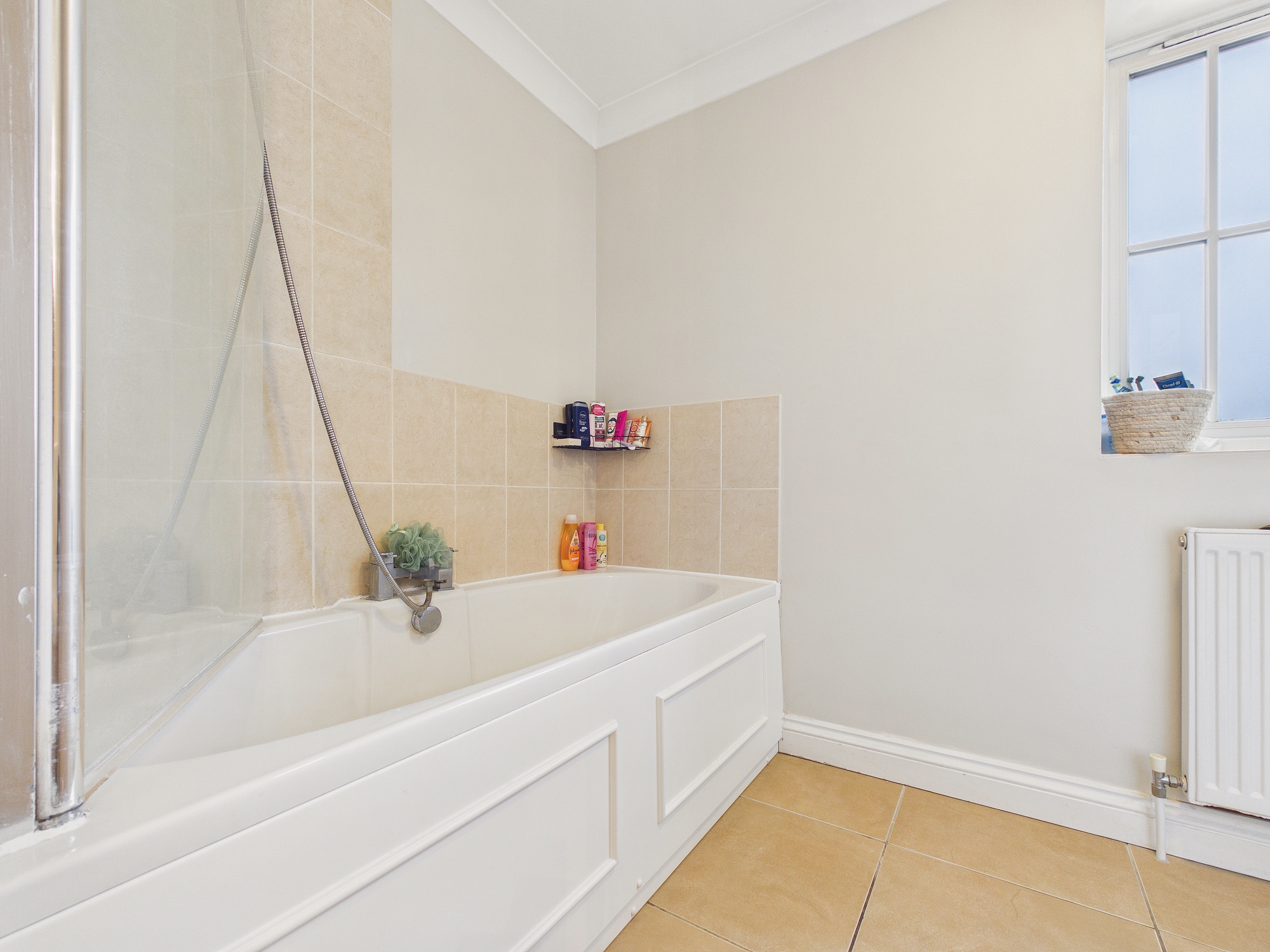 Bath with shower attachment over, low level w.c., handwash basin inset to vanity storage unit, wall mounted radiator, uPVC double glazed window to front, extractor fan.