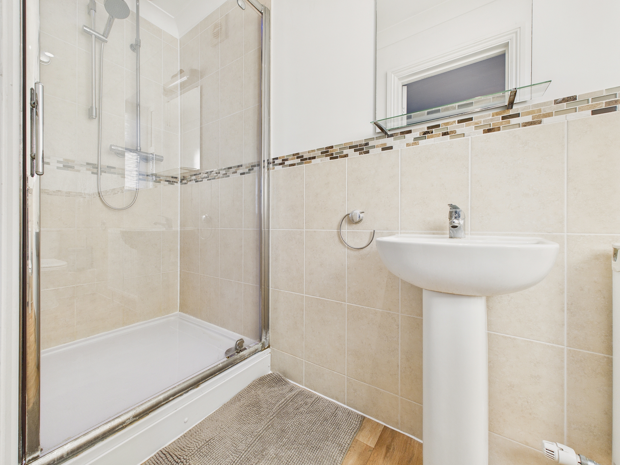 Shower cubicle, low level w.c., handwash basin, wall mounted radiator, uPVC double glazed window to side, extractor fan.