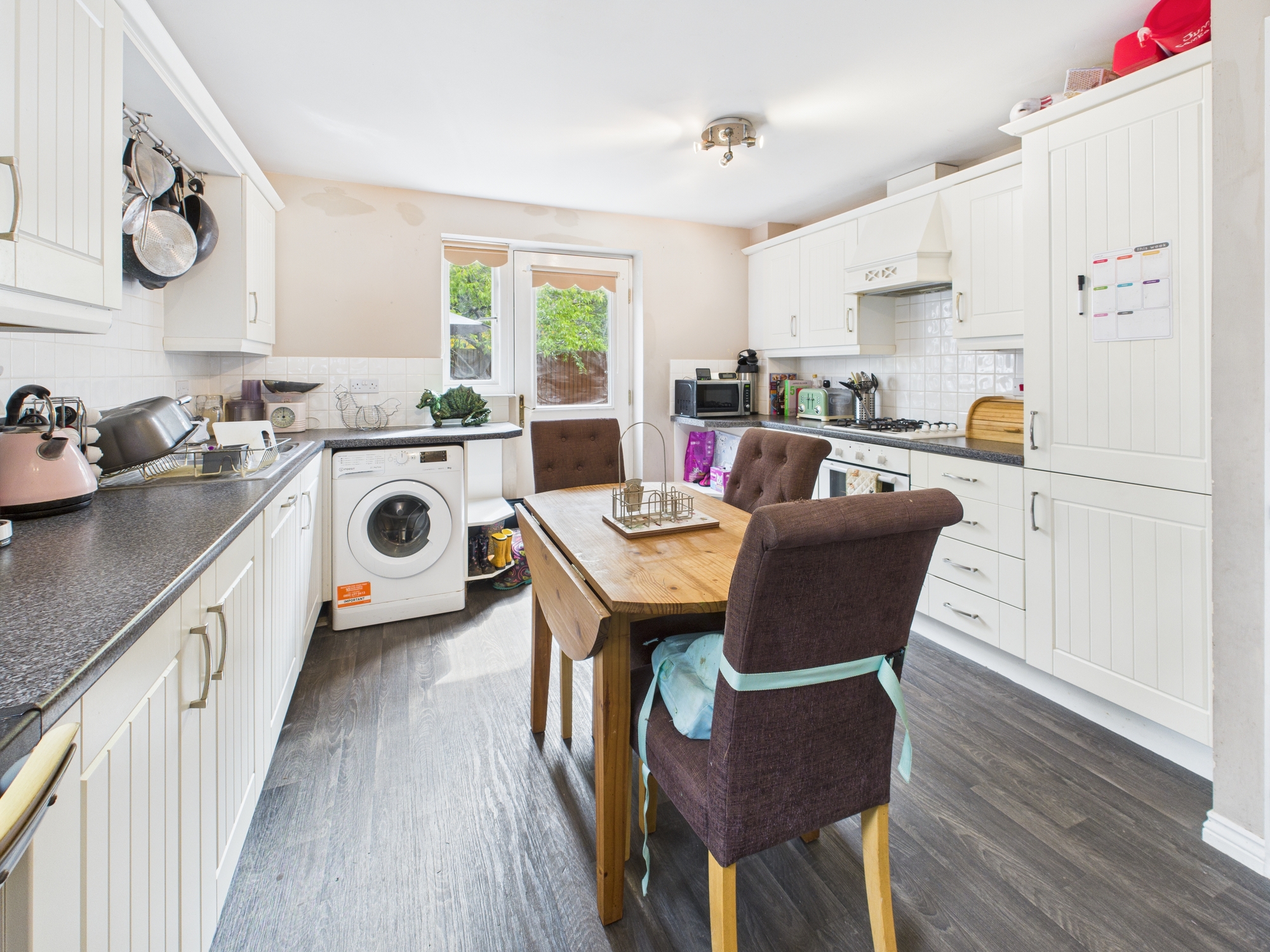 Matching wall and base units with worktop over, stainless steel 1 1/2 bowl sink drainer, space for washing machine, integrated fridge/freezer, gas hob with electric oven under, extractor over, uPVC double glazed window, door to garden.