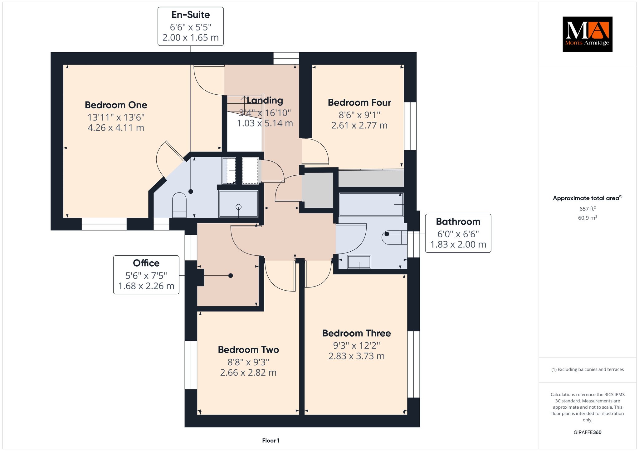 Bedroom One 13’11” x 13’6” (4.26m x 4.11m)