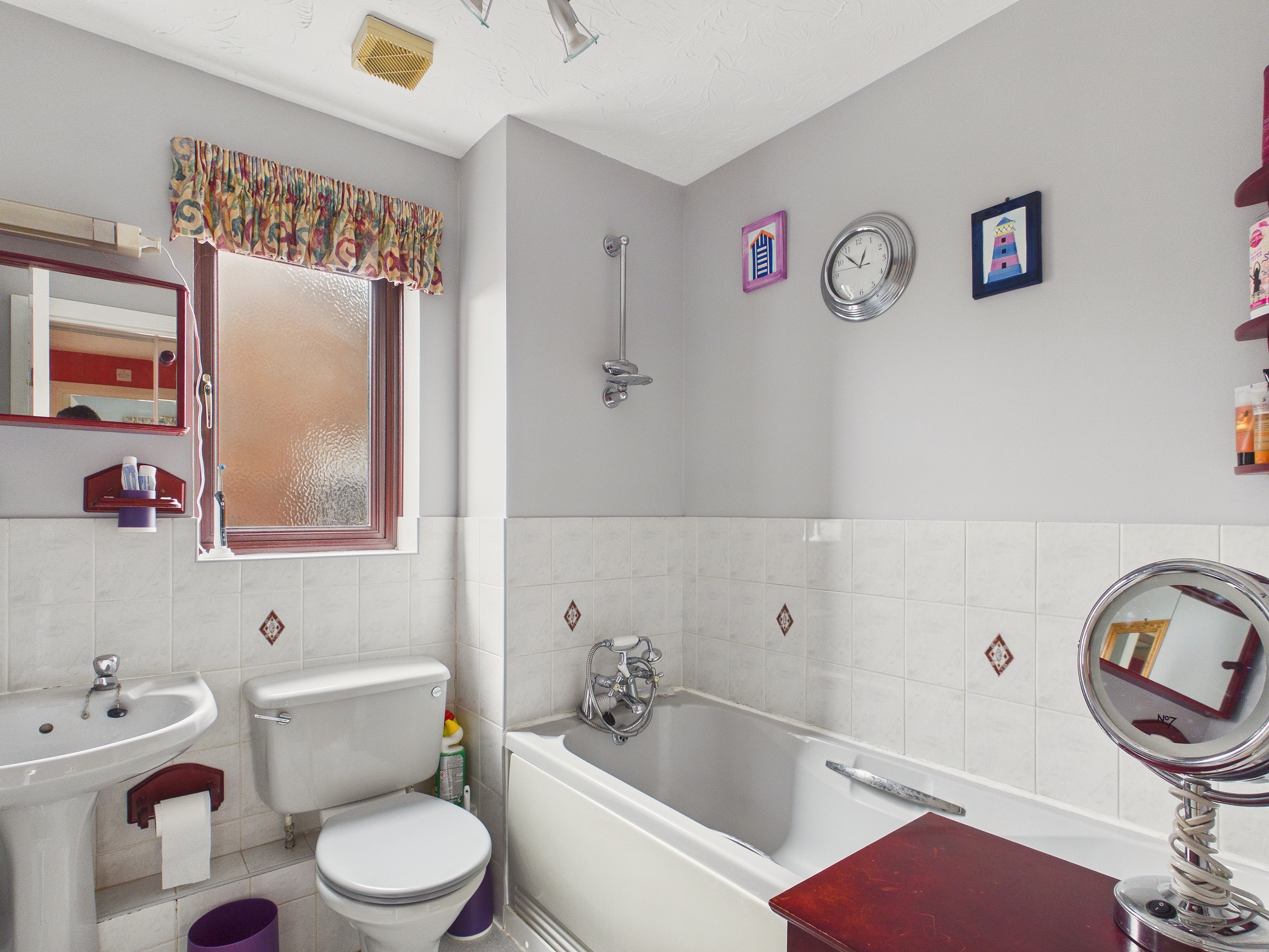 uPVC double glazed window to the side, panelled bath with shower attachment over, low level w.c., pedestal handwash basin with light and shaver point over, single panel radiator.