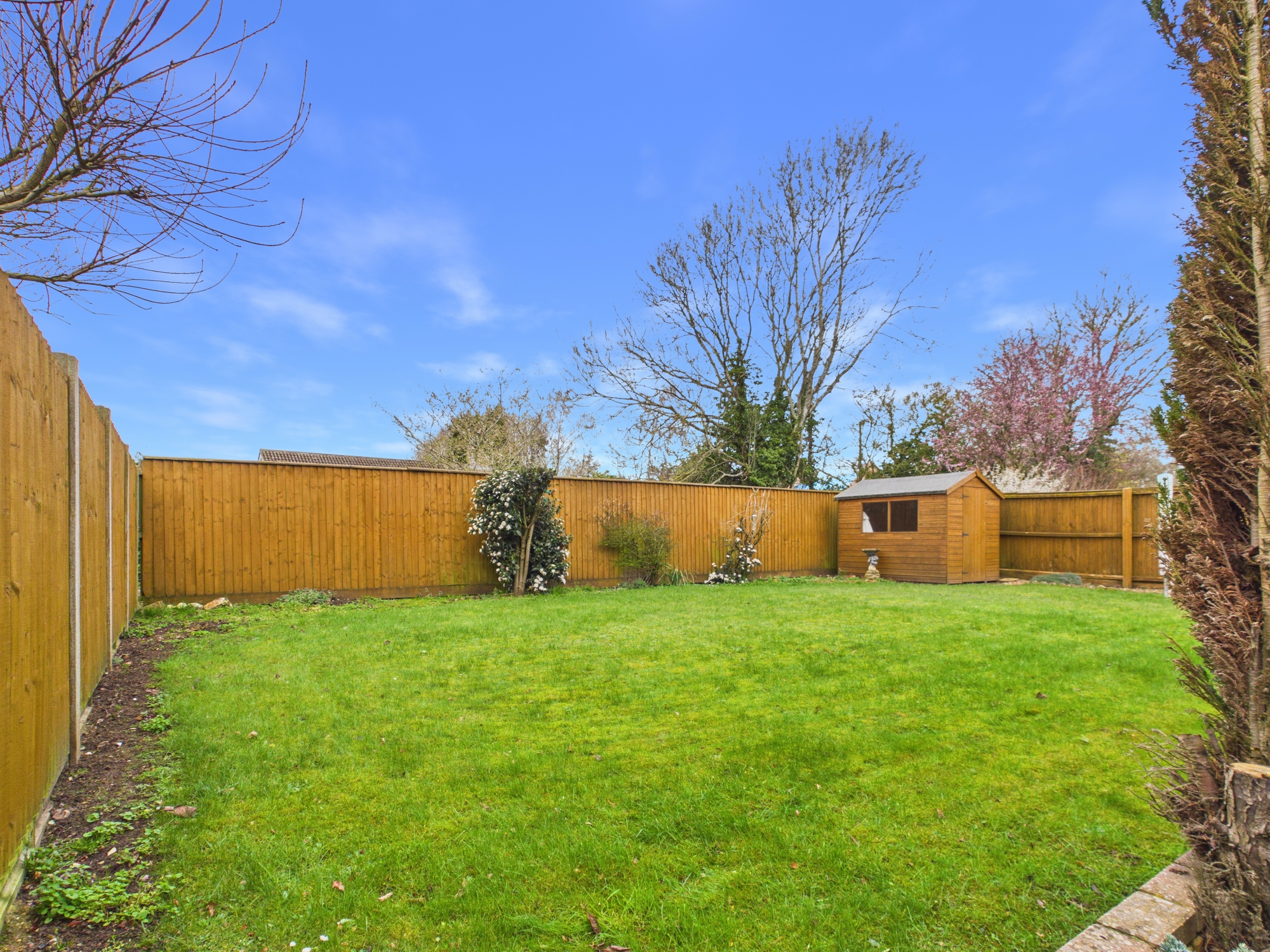 The property enjoys a generous frontage which has a tarmac driveway providing parking for vehicles along with a lawn front garden and additional area to the side laid to gravel. A path extends to the side passing through a timber gate. Around to the rear, there is a lower-level patio that runs across the back of the property itself with steps leading through to the lawn. There are some maturing shrubs that run to the front of the patio. The majority of the gardens are laid to lawn and are enclosed by timber fencing. A path extends to the side leading to the timber garden shed.