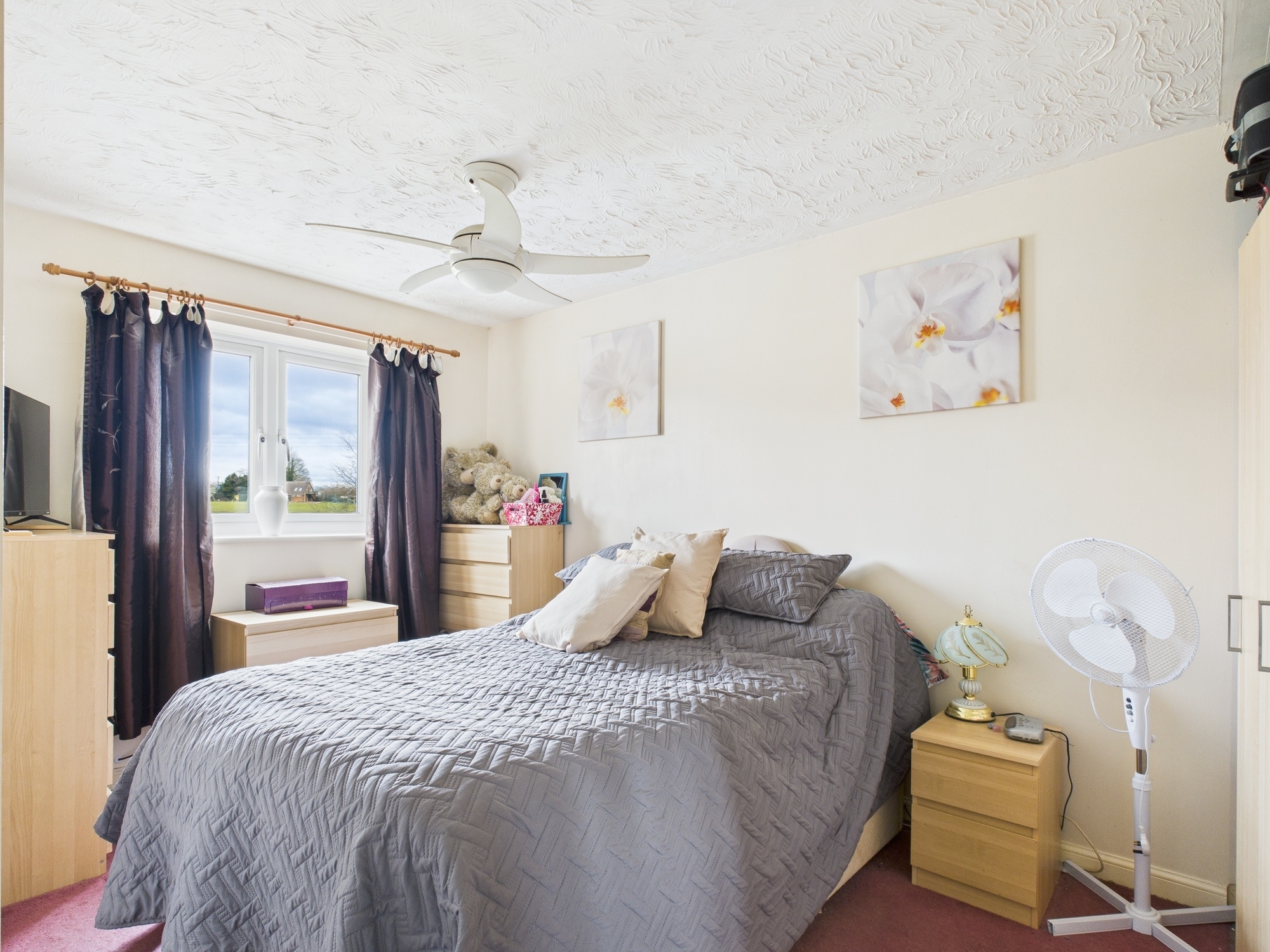 uPVC double glazed window to front, wall mounted double panel radiator, textured ceiling with fan.