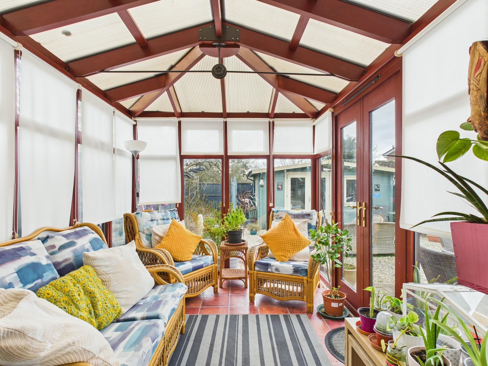 Wooden double glazed construction with polycarbonate roofing, access to rear garden, lino style floors.