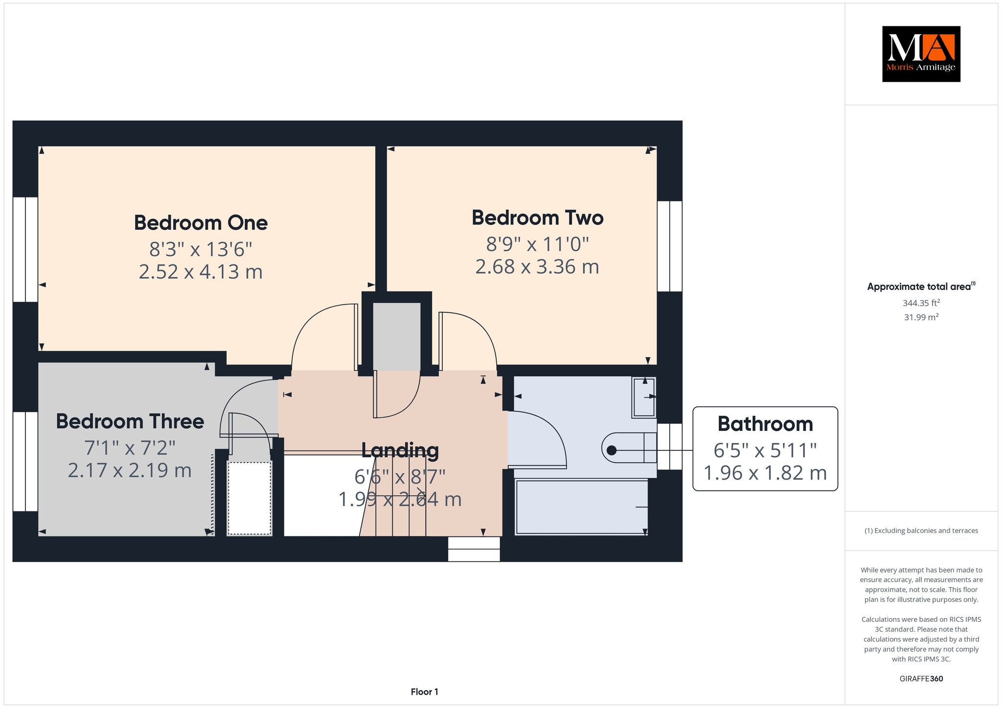 Bedroom One 13’6” x 8’8” (4.13m x 2.52m)