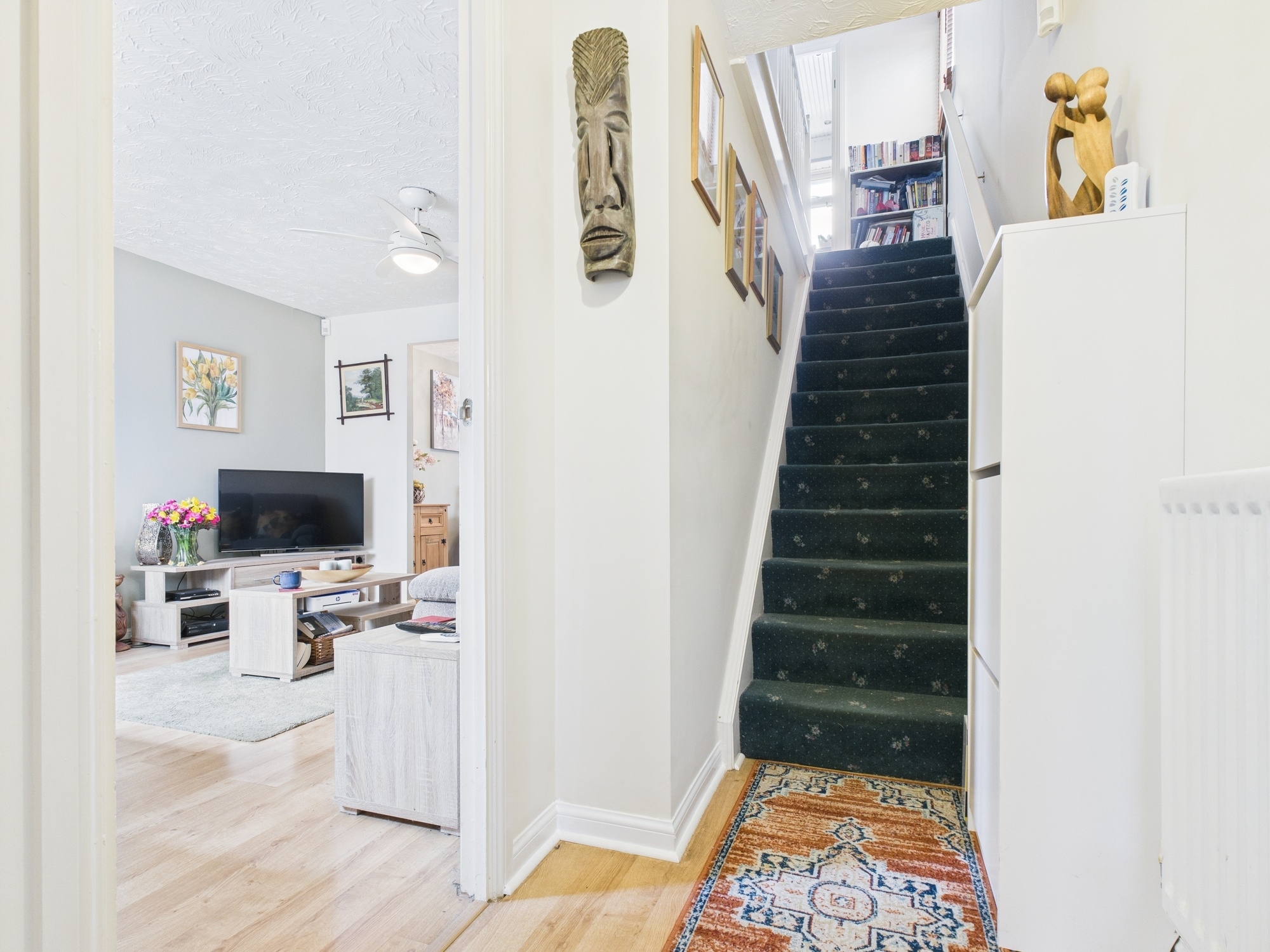 Wall mounted single panel radiator, stairs to first floor, laminate style flooring, textured ceiling, door to cloakroom, door to:-