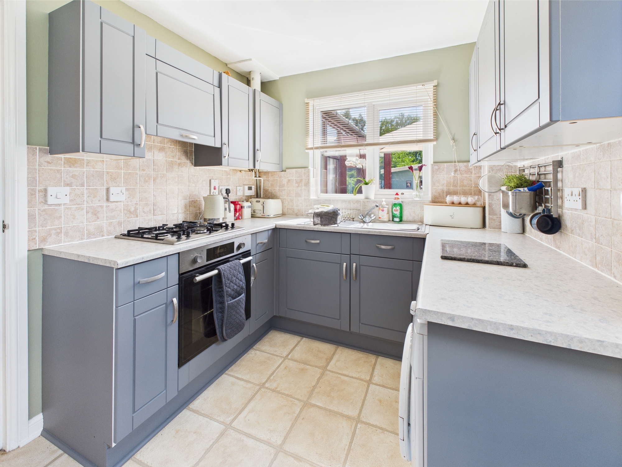 uPVC double glazed window to rear, uPVC double glazed door to side, ,wall mounted double panel radiator, door to under stairs storage cupboard, wall and base units under round edge worksurfaces, stainless steel sink drainer with mixer tap over, ring gas hob inset to worksurface with oven under and extractor over, space for washing machine, space for under counter fridge and freezer, laminate style flooring.