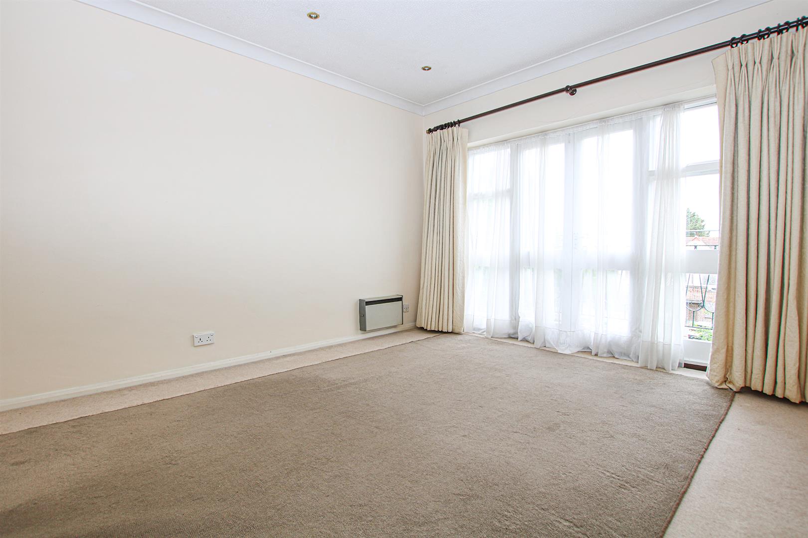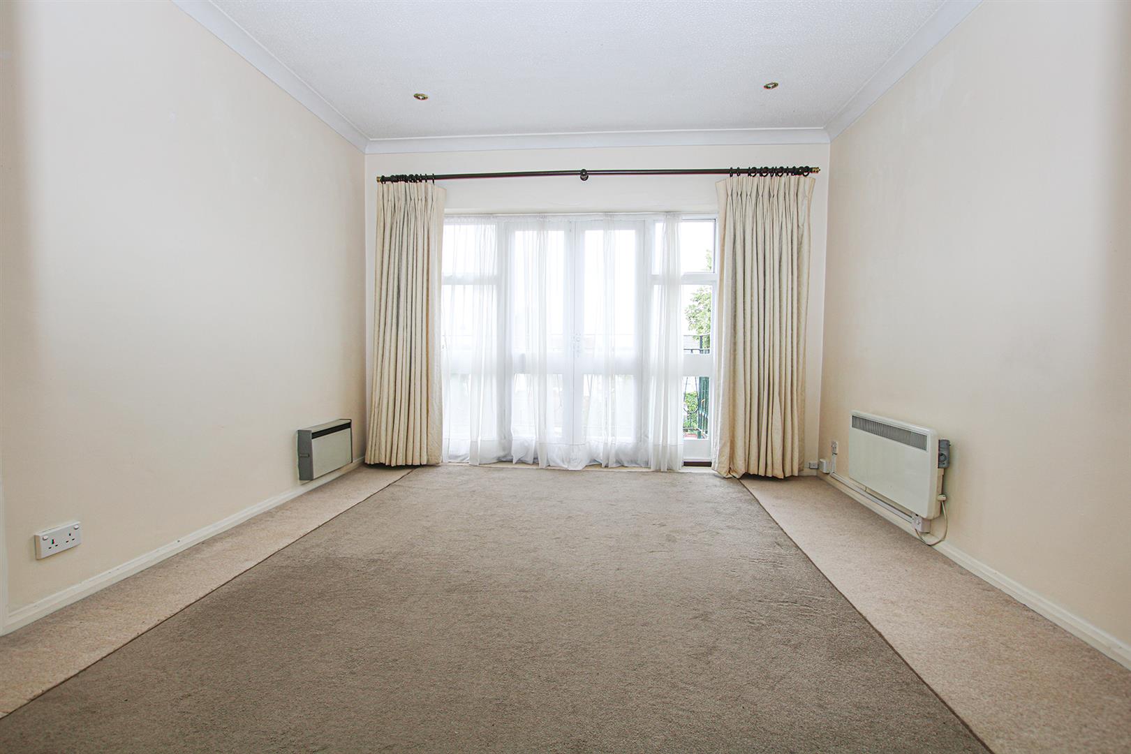 Spacious living room with French doors leading to balcony with full height windows either side and views over the communal garden. Electric storage heaters. Door to entrance hall.