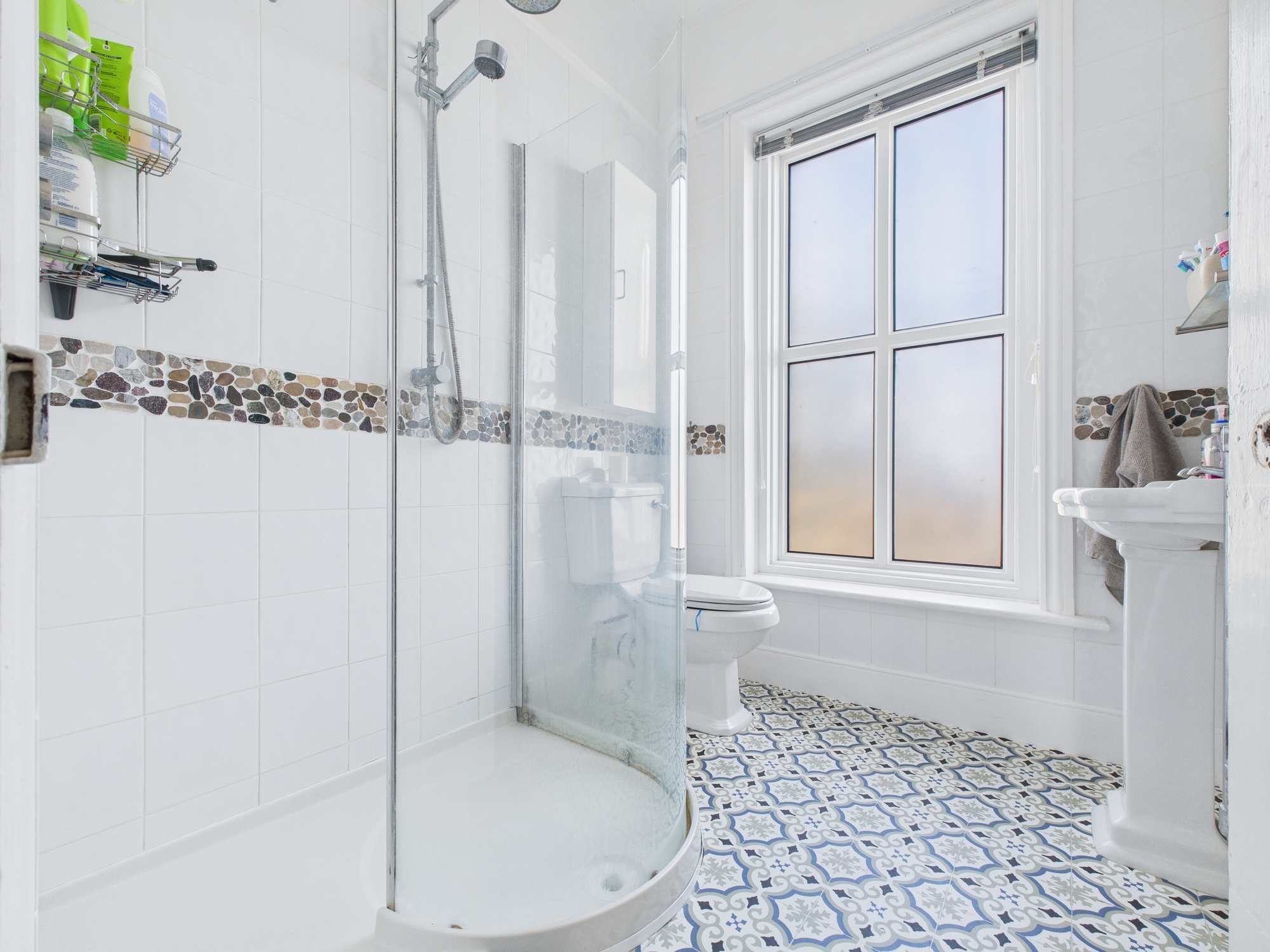 Double glazed window to front, walk-in shower cubicle, pedestal washbasin, low level WC, tiling to walls, original picture rails, wall mounted heated towel rail.