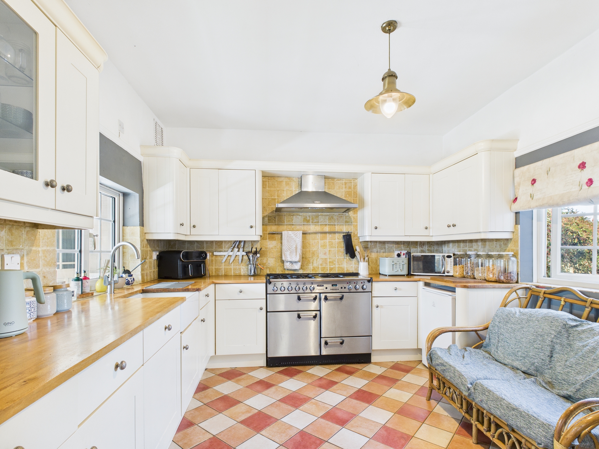 A cosy room with an original, fully functioning Aga range cooker providing additional heat and cooking facility. Double glazed window overlooks the side, tiled flooring, further built-in storage cupboard, original picture rails, double glazed double doors to conservatory, door with stained glass inserts leading back to hallway and doorway through to:-