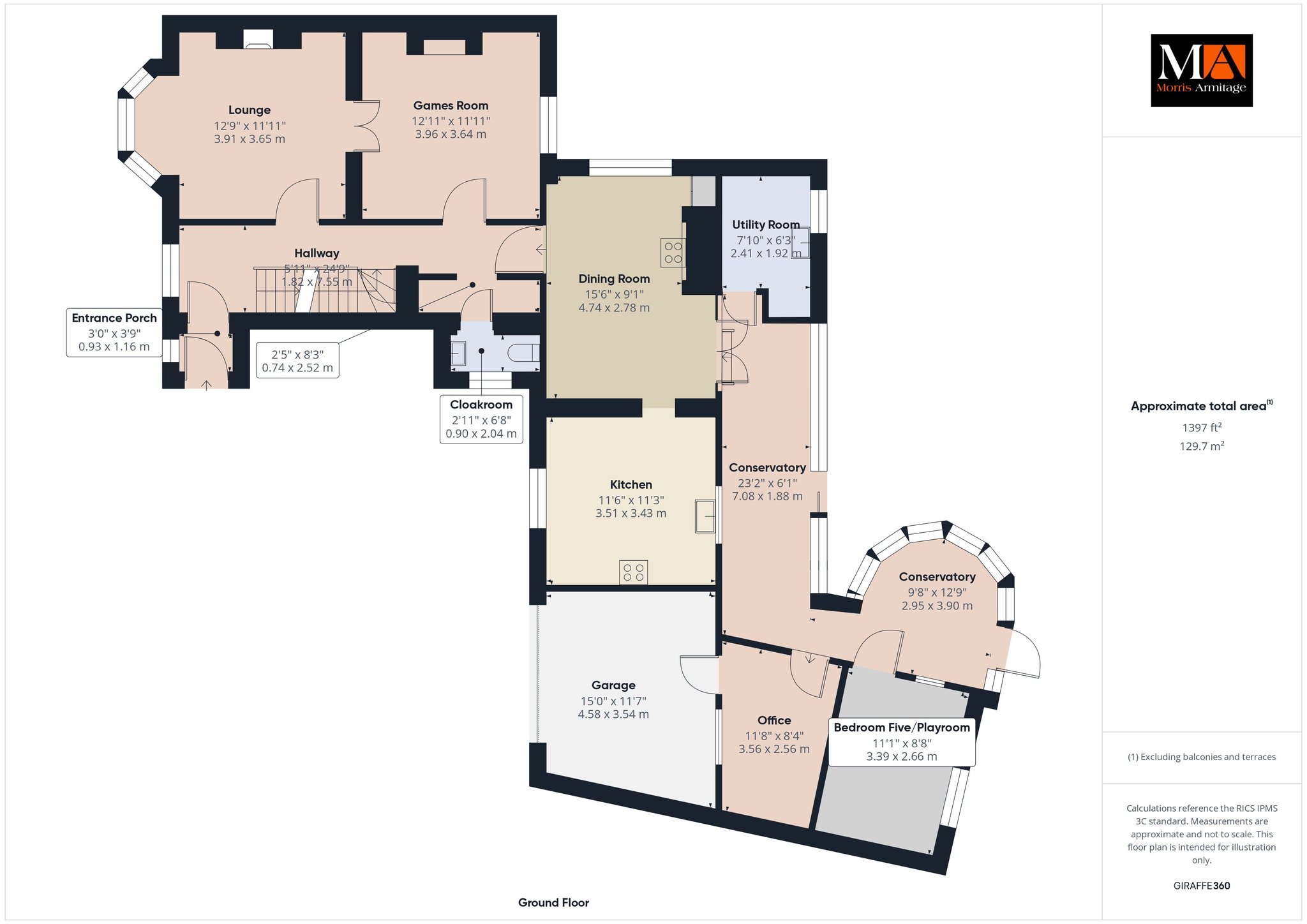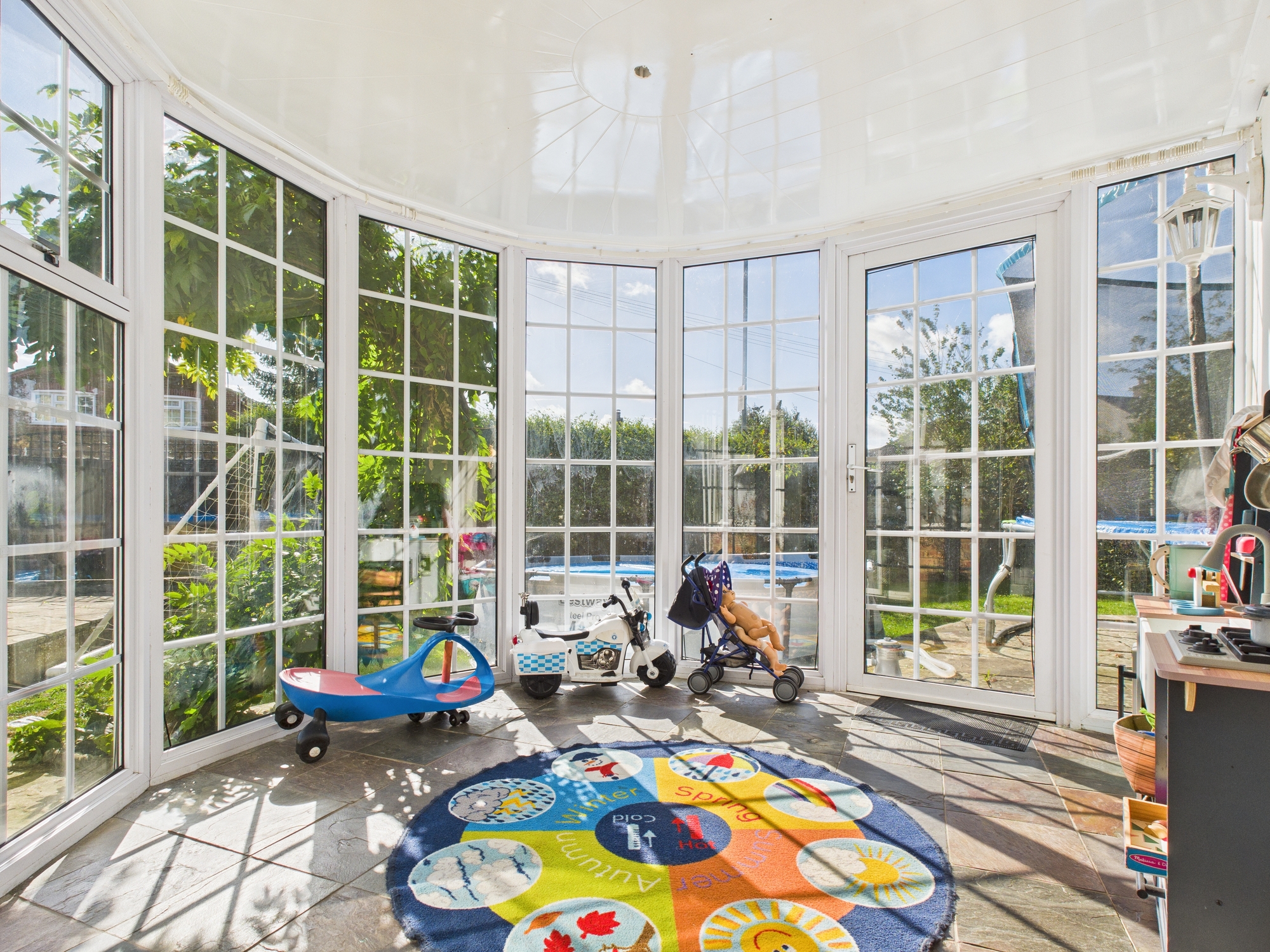 An L-shaped room extending along the rear of the property with uPVC double glazed windows and tiled flooring, culminating in a room with floor to ceiling uPVC double glazed bay windows. Access doors to garden, door to utility and door to study and ground floor bedroom/playroom.