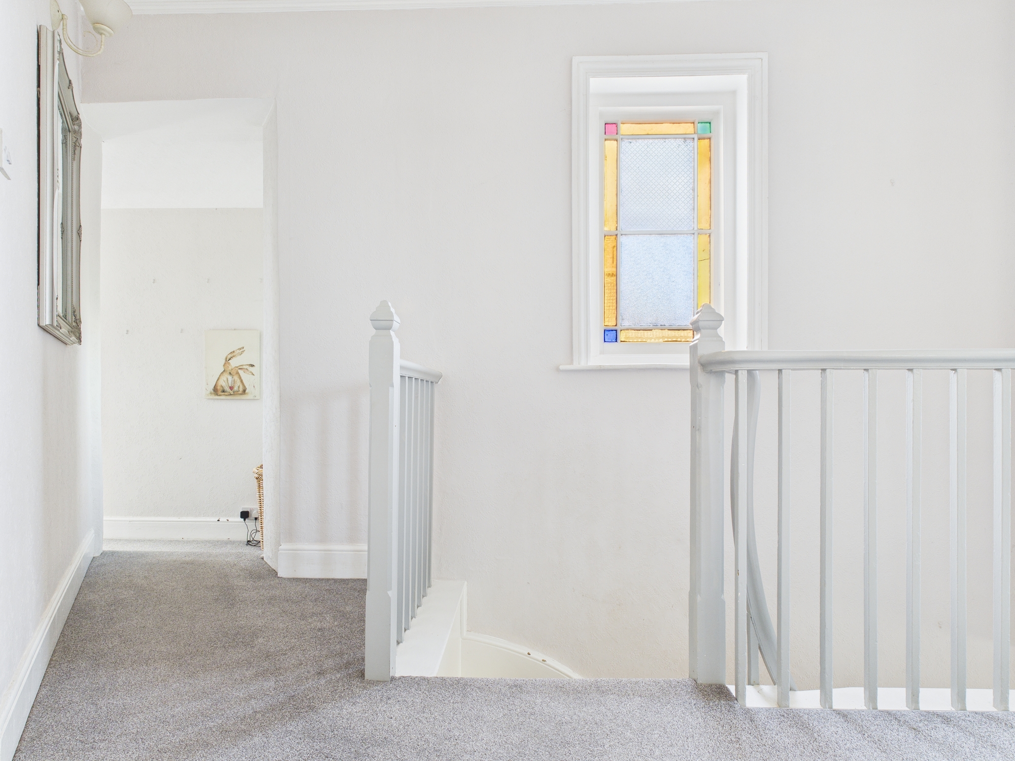 Attractive stained glass windows to the side, original picture rails, step leading through to inner landing with further stained glass window, door to double size airing cupboard, single panelled radiator.