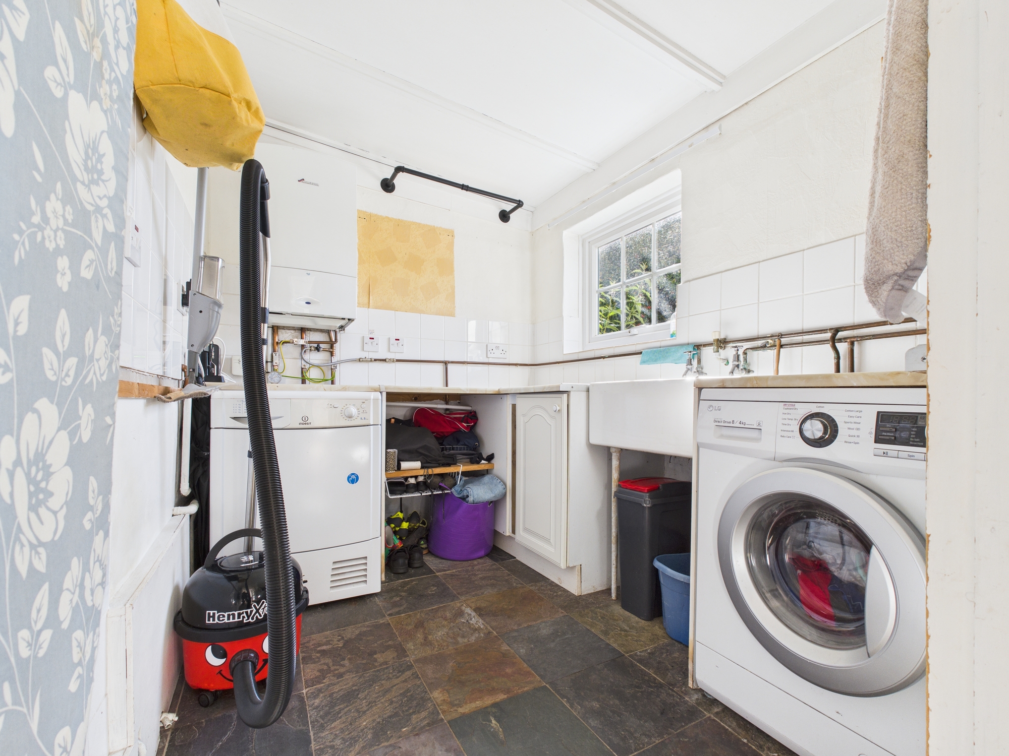 Double glazed window to the rear, butler sink and preparation surfaces, space for washing machine and other appliances, wall mounted gas fired central heating boiler.