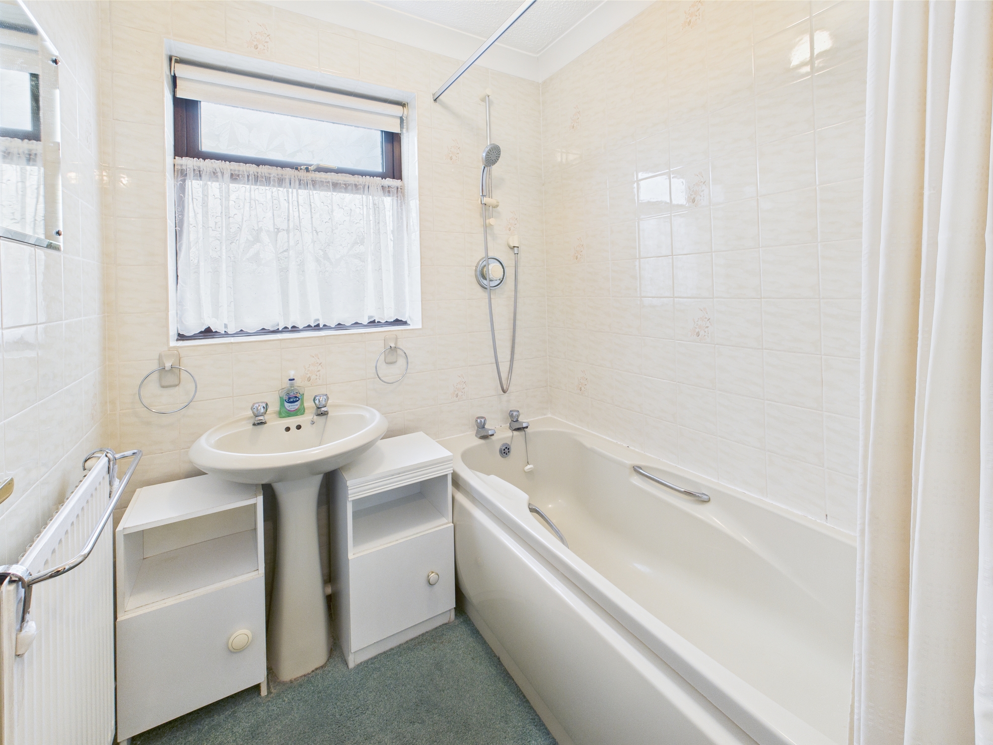 Panelled bath with shower attachment over, handwash basin, wall mounted radiator, uPVC double glazed window to side.