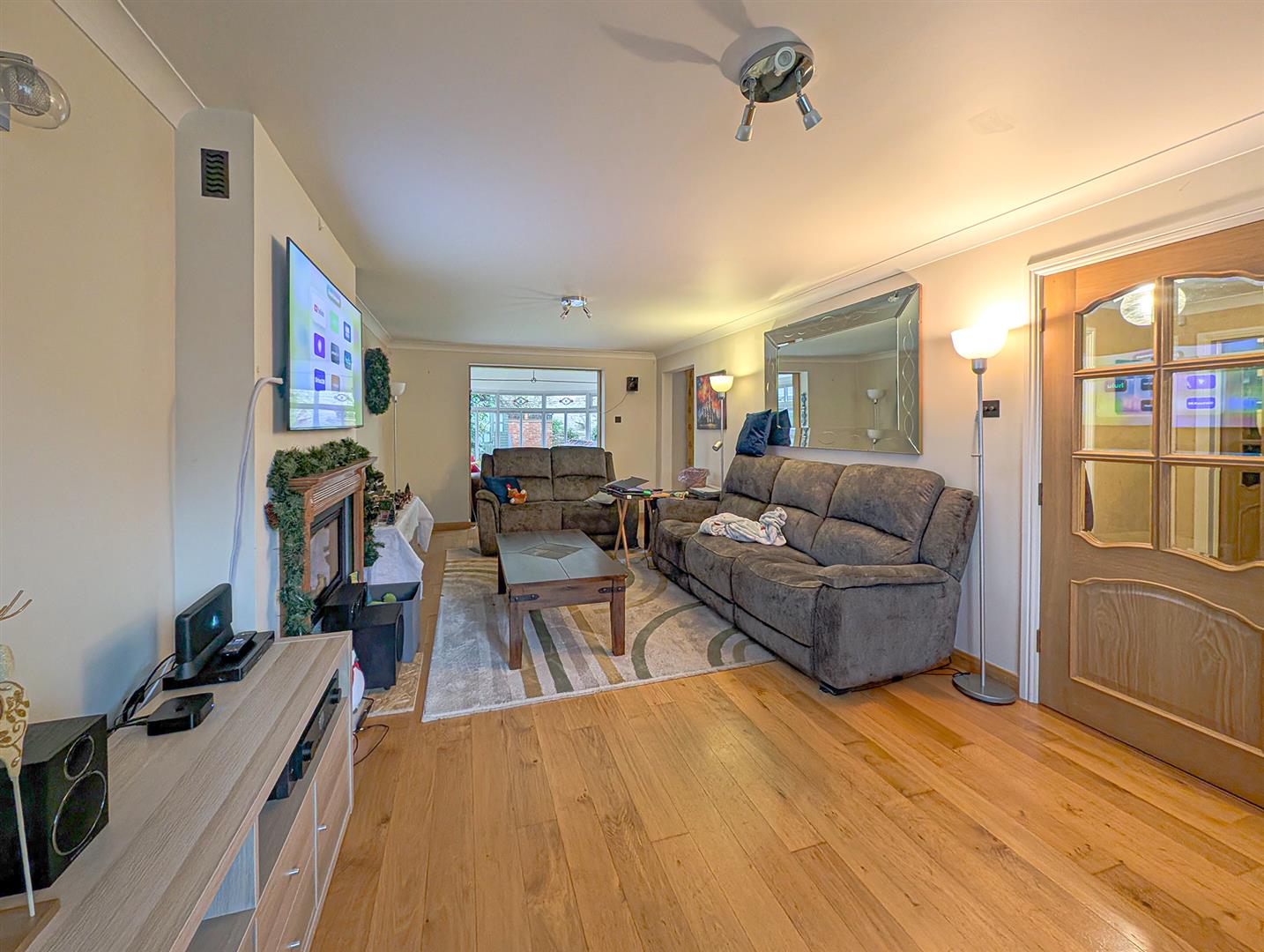 Spacious living room with wood flooring. Inset, contemporary fireplace with wooden surround and mantel. Radiator. Openings to the conservatory and dining room. Glazed double doors to the entrance hall. Window to the front aspect.