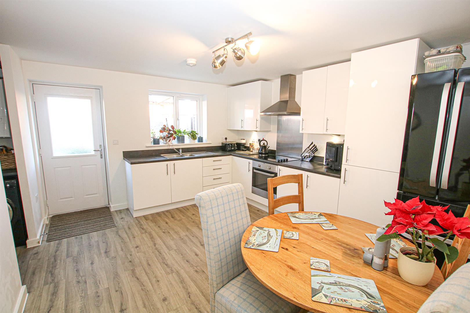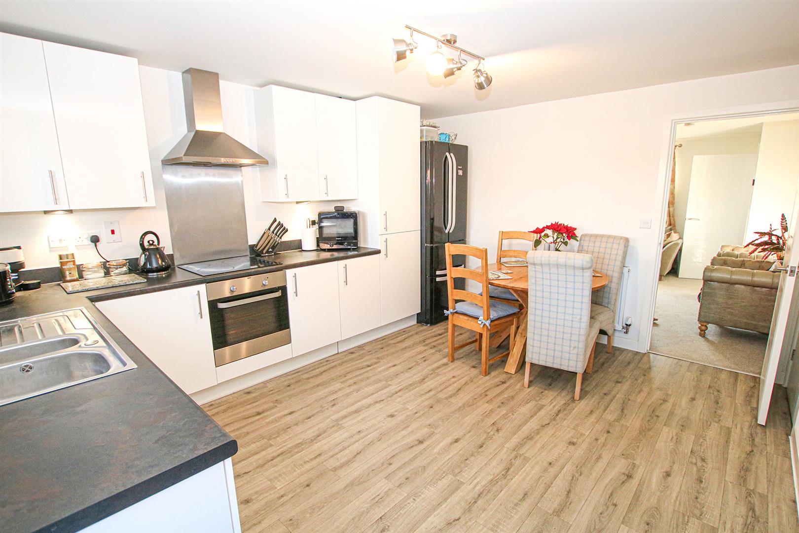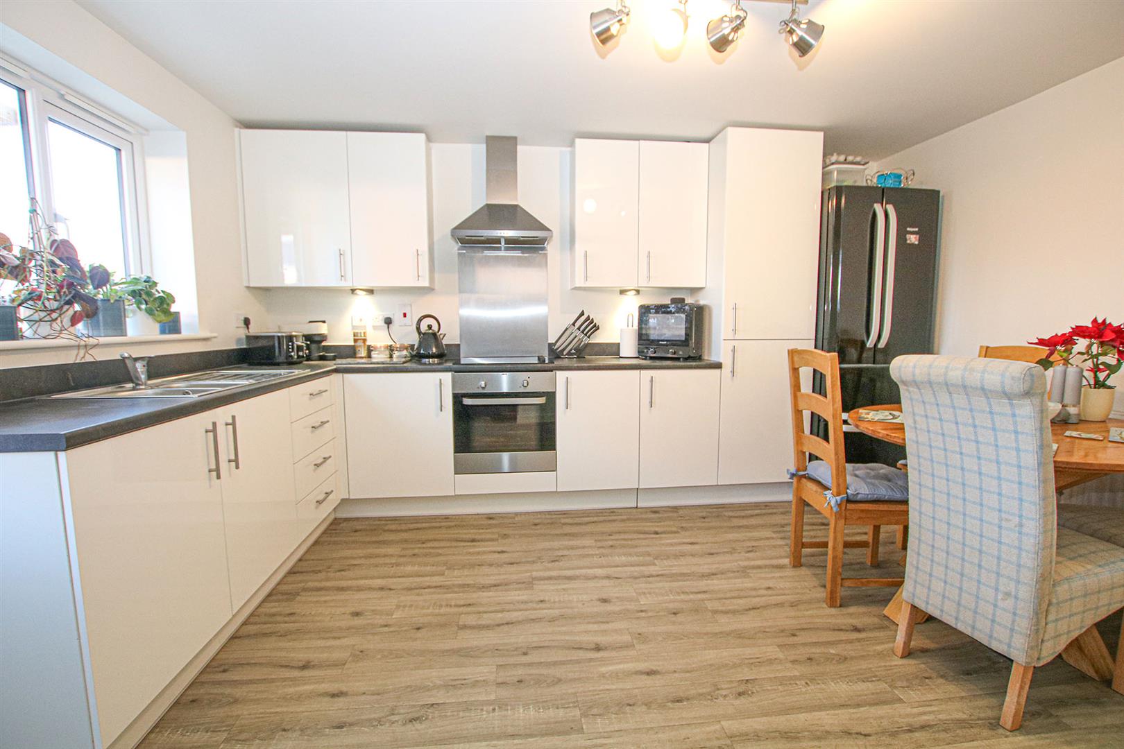 Generous kitchen/dining room with wood effect flooring. Kitchen: Contemporary range of eye and base level cupboards with composite work top over. Stainless 1 and 1/4 bowl sink and drainer with mixer tap over. Integrated oven with inset hob over and stainless steel extractor over and splash back. Space for American style fridge/freezer. Radiator. Opening to utility area with base cupboard and work top. Door to cloakroom. Space and plumbing for washing machine. Window overlooking rear garden. Half glazed door leading to rear patio area. Door to storage cupboard.