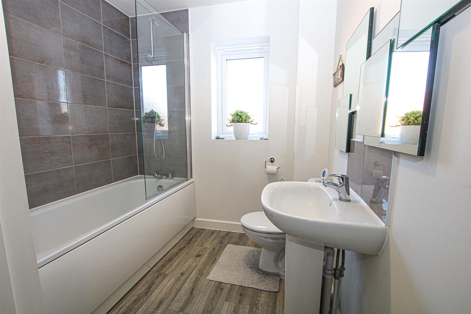 Contemporary white suite comprising low level W.C., pedestal hand basin with mixer tap over and panelled bath with mixer tap and wall mounted shower over with glass screen. Attractively tiled to wet areas. Wood effect flooring. Obscured window. Door to storage cupboard. Door to landing.