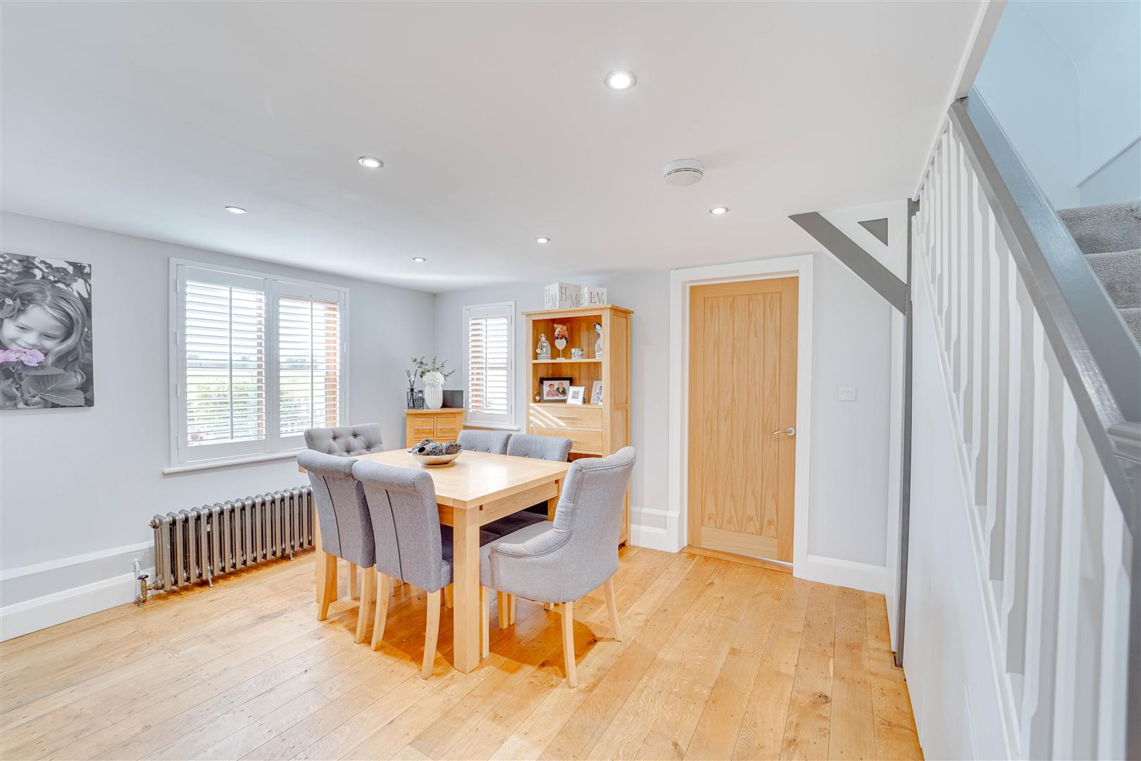 Laid wooden flooring, radiator, staircase rising to the first floor with storage under, windows to the front and side aspect.