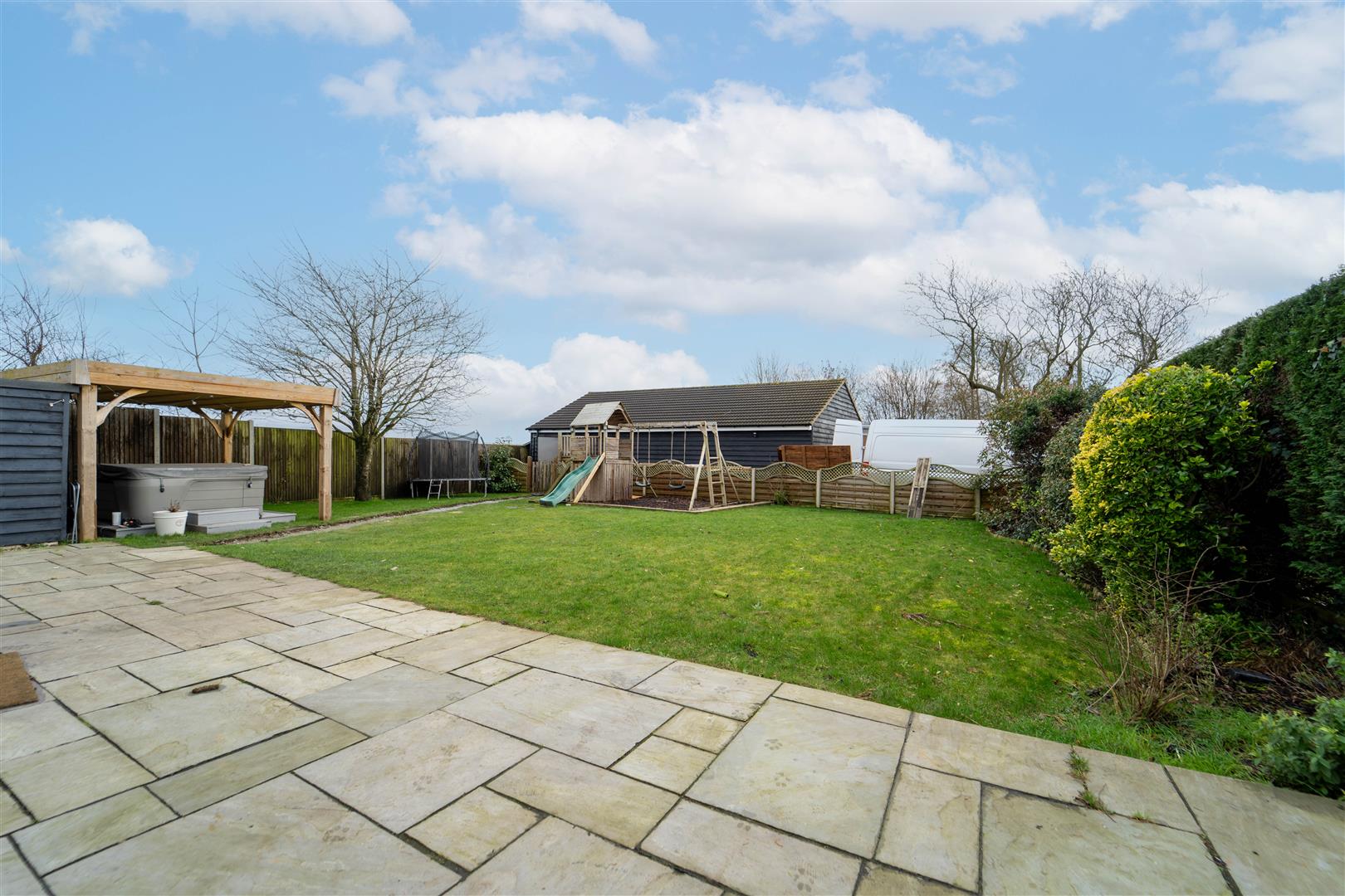 Generous sized garden mostly laid to lawn with barked play area, wooden pergola, variety of mature trees and shrubs, patio area leading through to side passage.