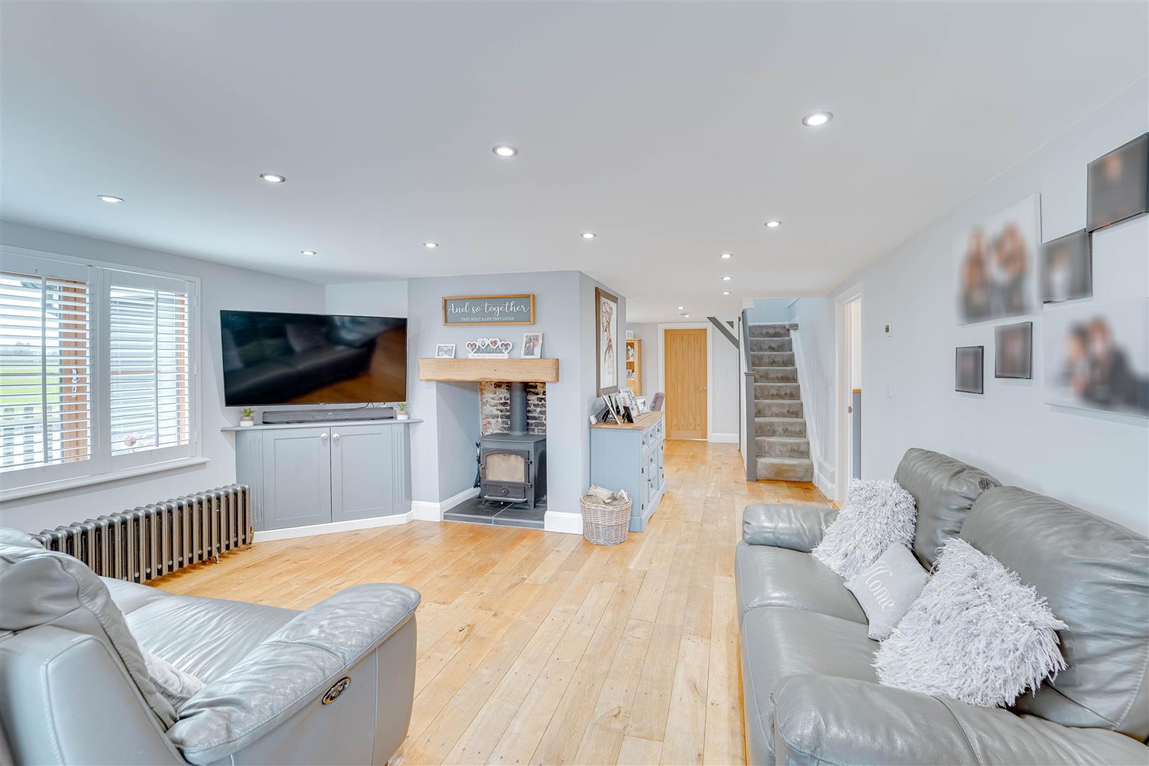 Spacious living room with featured log burner and wooden mantle, TV connection point, radiator, laid wooden flooring and windows to the front and side aspect.