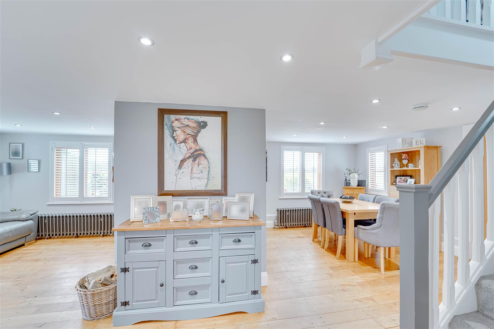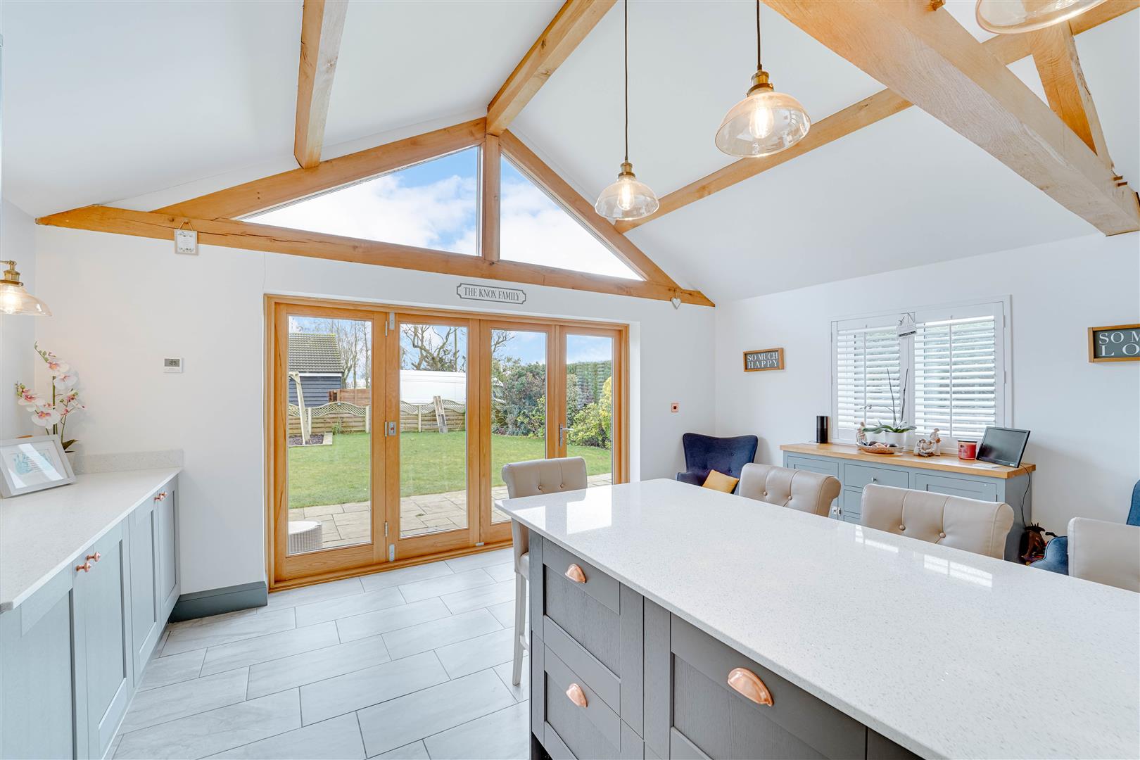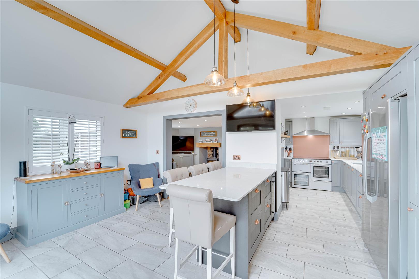 Modern fitted kitchen fitted with a range of both eye and base level storage units and working surfaces over, under mounted stainless steel sink with mixer tap, tiled splashback area, breakfast bar with pendant lighting, range oven with five-ring electric hob and extractor hood above, integrated microwave, dishwasher, space for fridge/freezer. Exposed beams, tiled flooring, windows to the side aspect and bi-folding doors out to the rear garden.